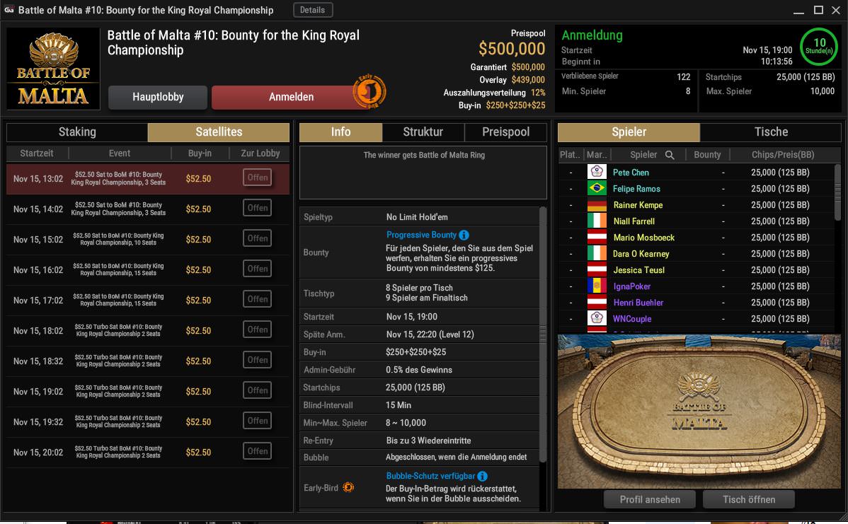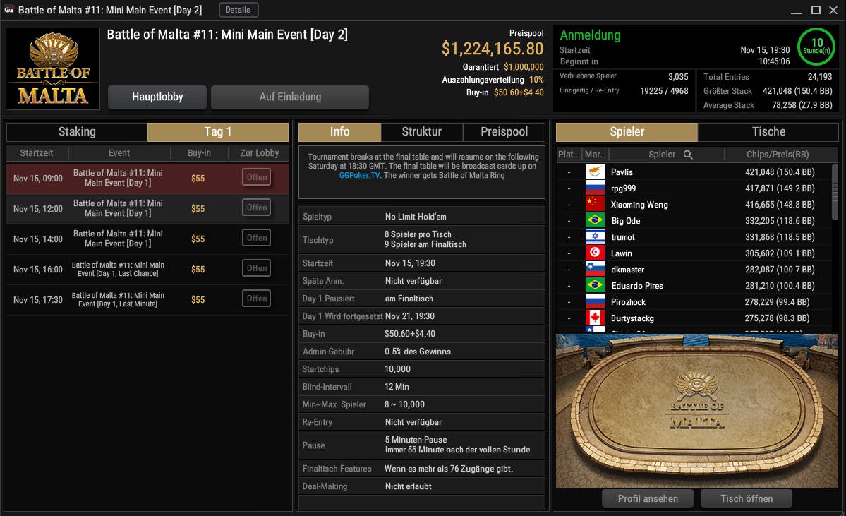 Heute stehen wieder zahlreiche Events beim Battle of Malta an. Höhepunkte sind ganz klar der zweite Spieltag beim $55 Mini Main Event (19:30 Uhr), mit schon jetzt über $1,2 Millionen im Preispool, sowie Ring Event Bounty of the King Royal, ein $525 NLHE PKO mit $500.000 GTD.