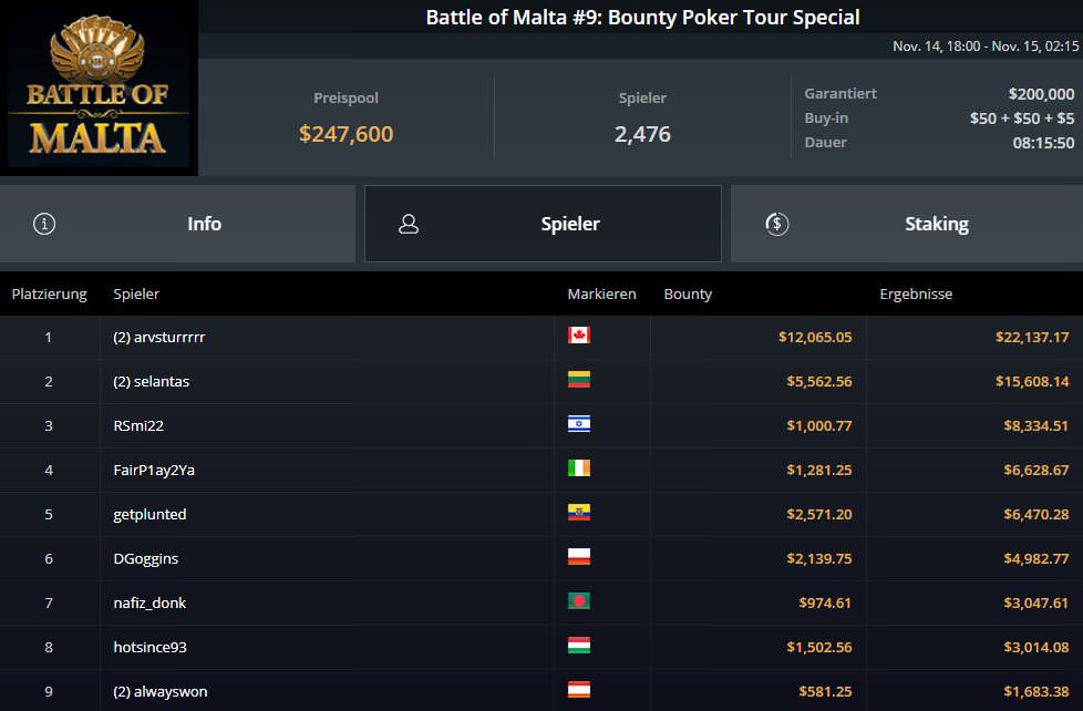 Den Sieg bei diesem Event, der mit 2.476 Entries stark besucht war, feierte arvsturrrrr aus Kanada. Inklusive Bounties räumte er $22.137,17 ab.