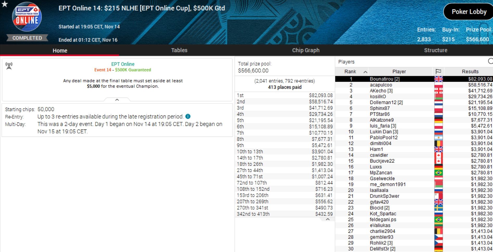 Beim $215 EPT Online Cup setzte sich Dominik „Bounatirou“ Nitsche am Finaltag gegen 129 Konkurrenten durch und kassierte ein Preisgeld von über $86.000.