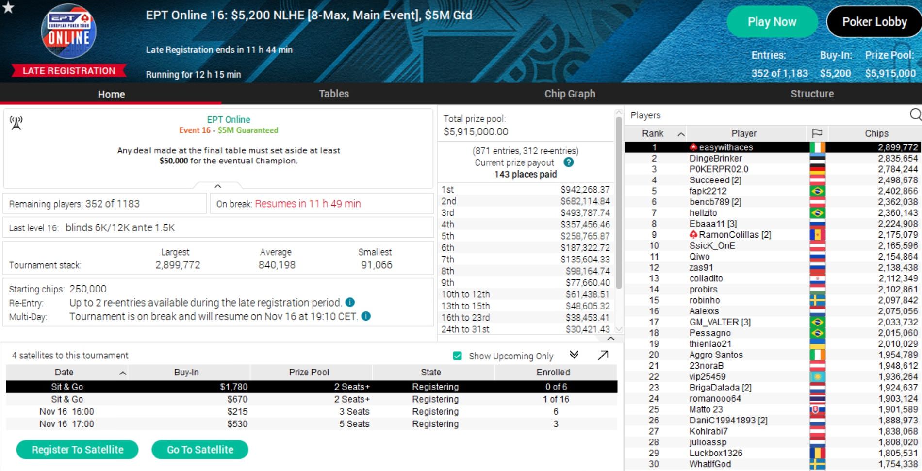 In Führung liegt nach Tag 1 PokerStars Pro Fintan „easywithaces“ Hand, doch mit „P0KERPR02.0“, Jakob „Succeeed“ Miegel und Ben „bencb789“ Rolle sind drei deutschsprachige Spieler unter den Top 6 klassiert.
