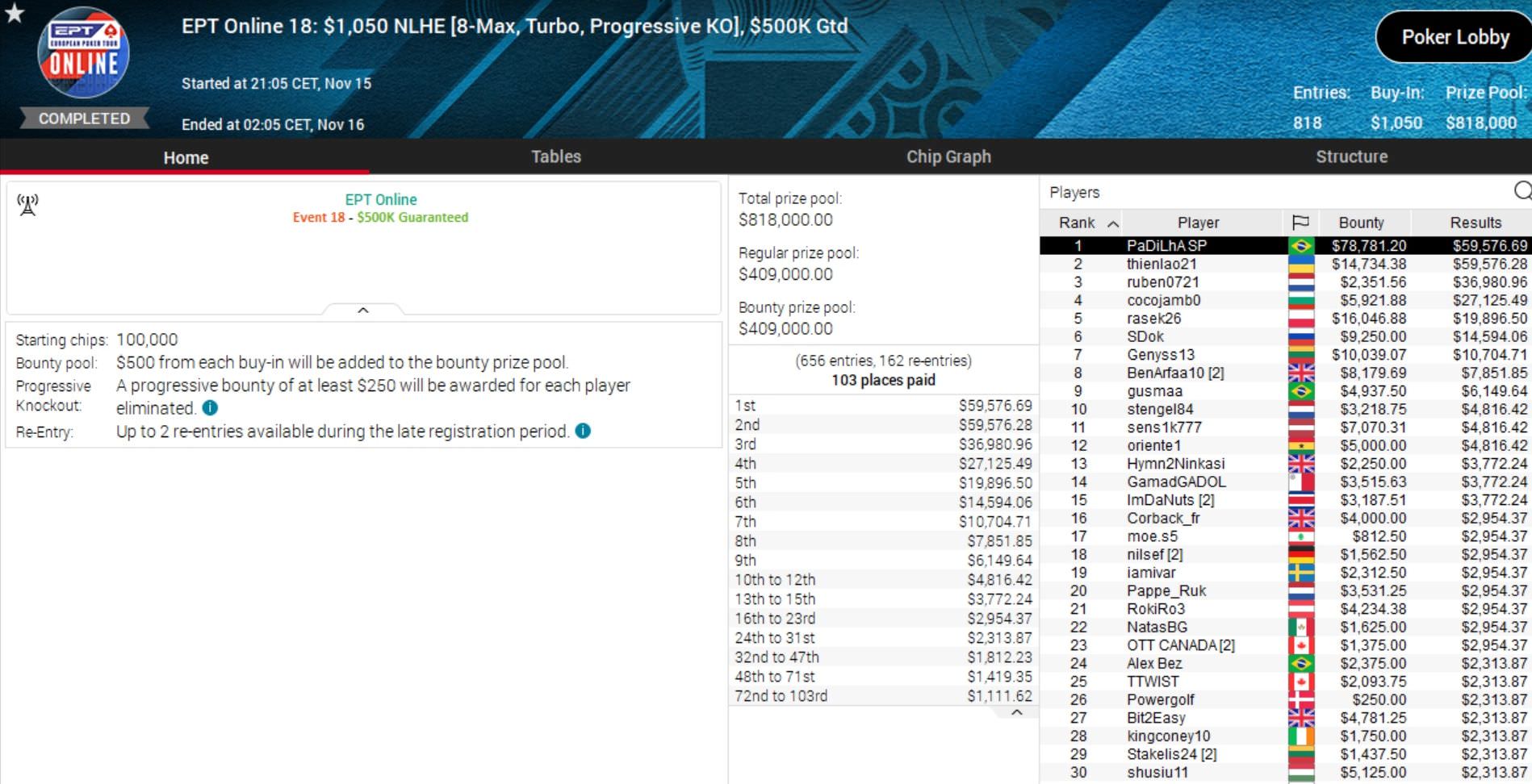 Ebenfalls entschieden wurde EPT Online 18, ein $1.050 NLHE, das 818 Entrys anlockte.