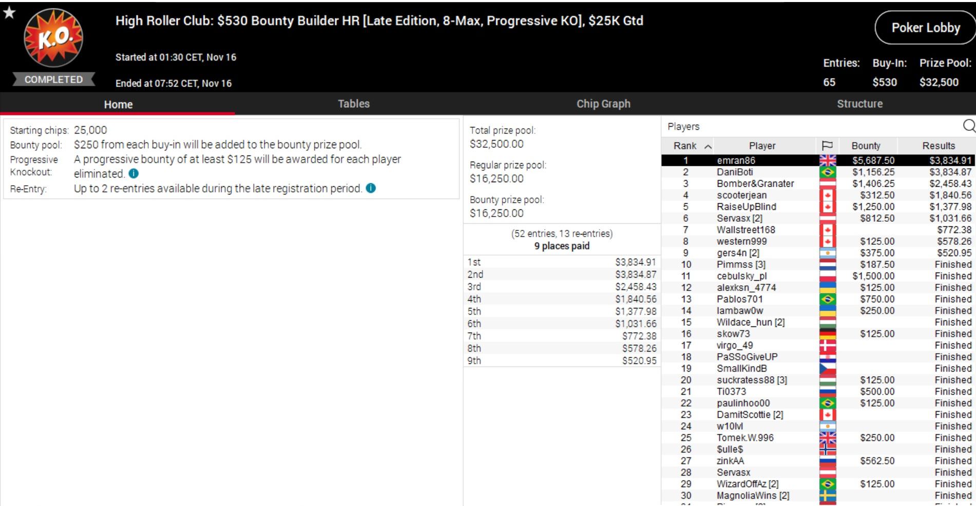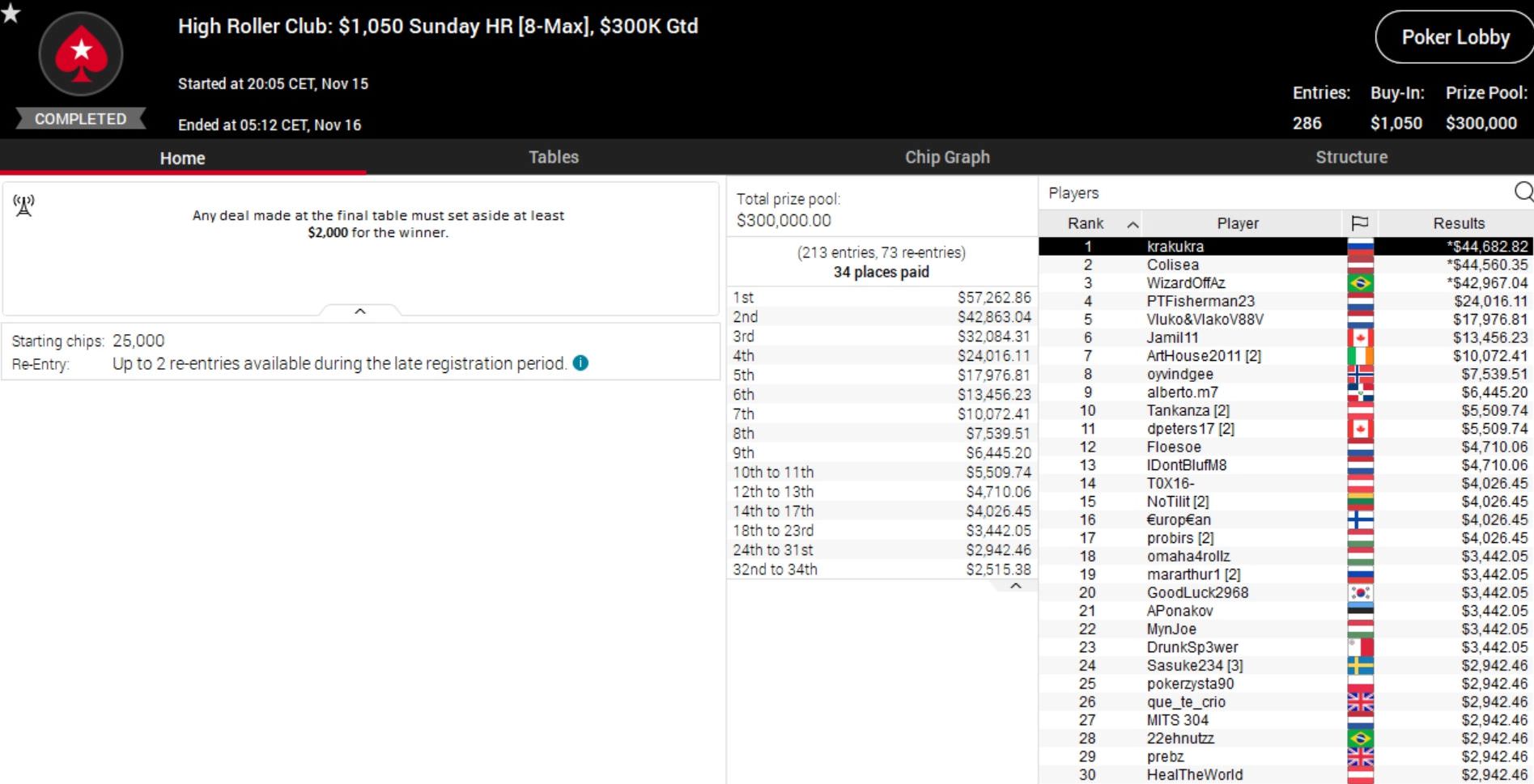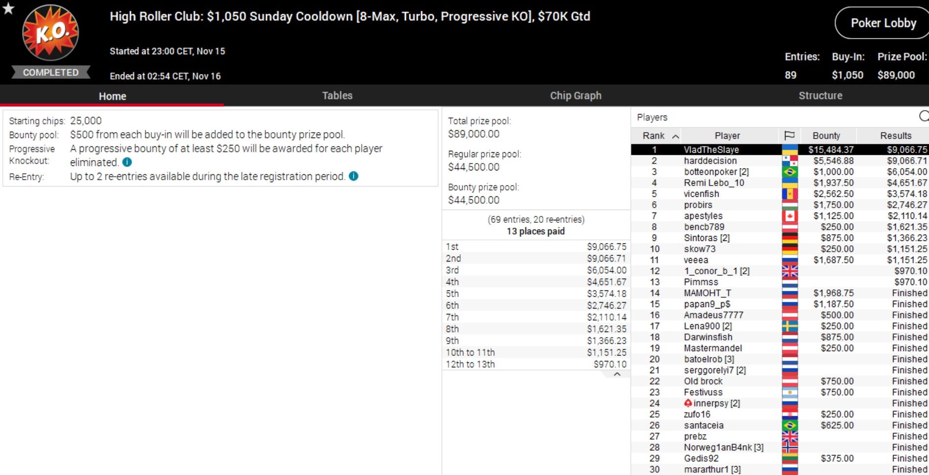 Das $2.100 Sunday Highroller wurde eine Beute des Russen Konstantin „krakukra“ Maslak. Er setzte sich im Heads-Up gegen den Polen Dzmitry „colisea“ Urbanovich durch und kassierte nach Deal gut $44.000.