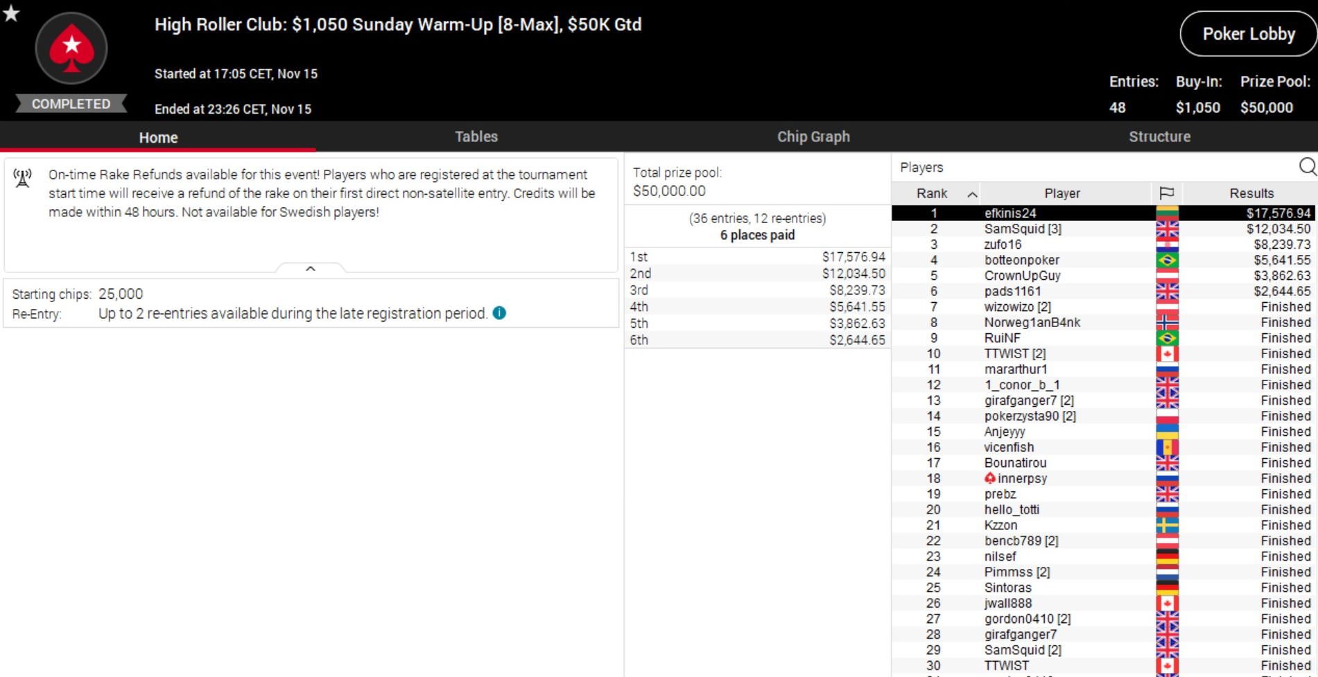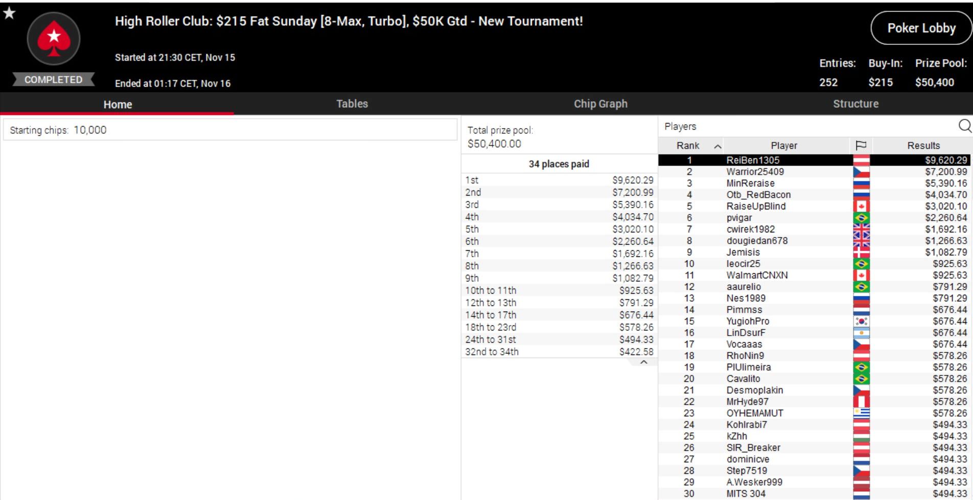 Beim $215 Fat Sunday setzte sich „ReiBen1305“ aus Österrich gegen 251 Konkurrenten durch und kassierte eine Siegprämie von über $9.600.