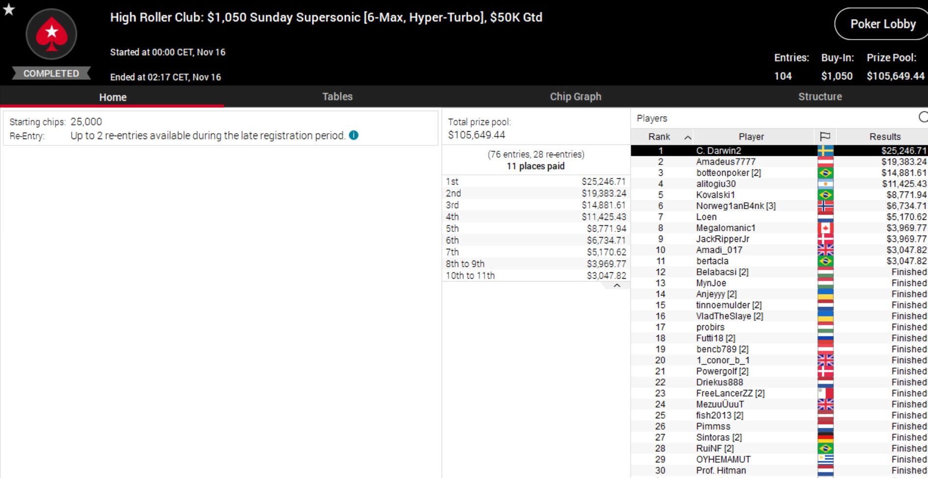 Dagegen musste sich „Amadeus7777“ beim $1.050 Sunday Supersonic dem Schweden Simon „C. Darwin2“ Mattsson beugen, durfte sich als Zweiter aber über mehr als $19.000 Preisgeld freuen.