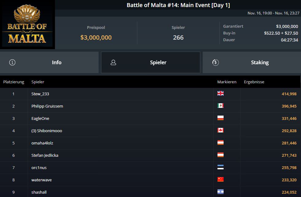 Gestern qualifizierten sich unter anderem Philipp Gruissem (396.945 Chips), Timo omaha4lolz Kamphues (281.446) und Stefan Jedlicka (271.743) mit sehr soliden Stacks für den zweiten Spieltag, der am kommenden Sonntag, dem 22. November, über die Bühne gehen wird.