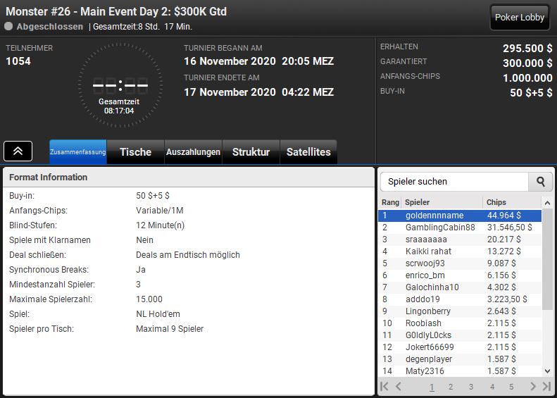 Beim $55 Main Event gab es bei 5.910 Entries ein minimales Overlay, sodass die verbliebenen 1.053 Spieler die garantierten $300.000 an Preisgeldern ausspielten. Es dauerte nicht lange, bis die 920 bezahlten Plätze erreicht waren, bis zur Entscheidung war es allerdings ein über achtstündiger Grind, den am Ende goldennnname im Heads-up gegen GamblingCabine88 ($31.546,50) zu seinen Gunsten entschied. Seine Prämie betrug satte $44.964.
