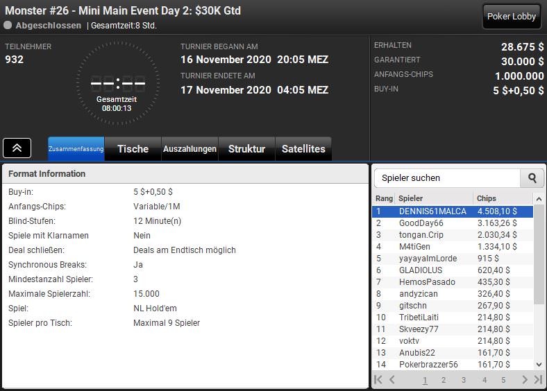 Nicht ganz so üppig waren die Preisgeldern beim Mini Main Event, allerdings betrug das Buy-in auch nur $5,50. Und dementsprechend kann sich die Siegprämie in Höhe von $4.508,10 für DENNIS61MALCA mehr als sehen lassen. Heads-up bezwang er GoodDay66, der $3.163,26 kassierte.