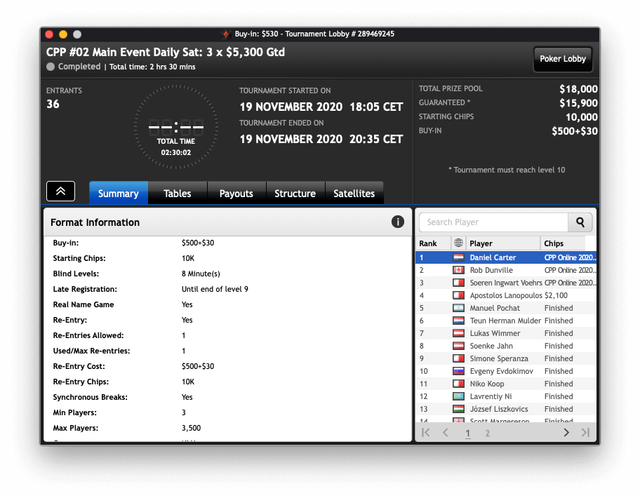 Cochrane gewann das CCP #06, ein PLO mit $3.200 Buy-In. 51 Entries sorgten für $153.000 Preispool – ein Entry über der Garantie. Er setzte sich im Heads-Up für $49.560 gegen seinen britischen Landsmann Phillip Mighall durch, der als Runner-Up $30.438 gewinnen konnte. Erster DACH-Spieler wurde Jens Lakemeier auf Platz 14 ohne Cash, der Mincash lag auf Platz 9 bei $6.655.