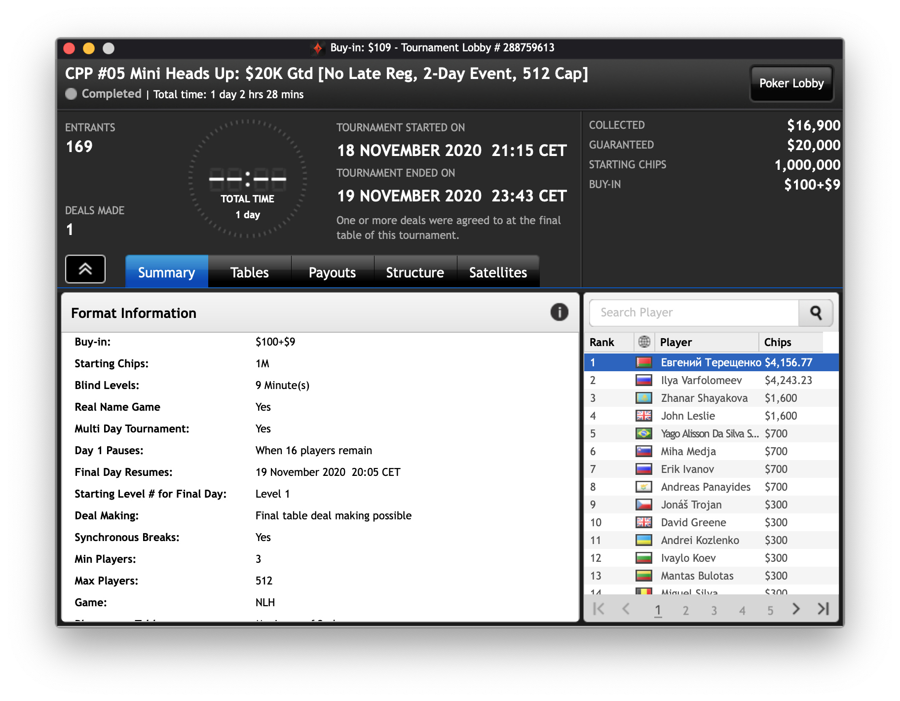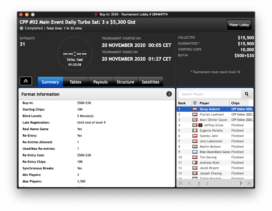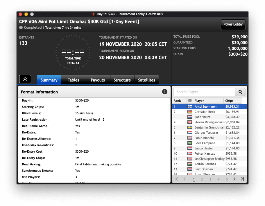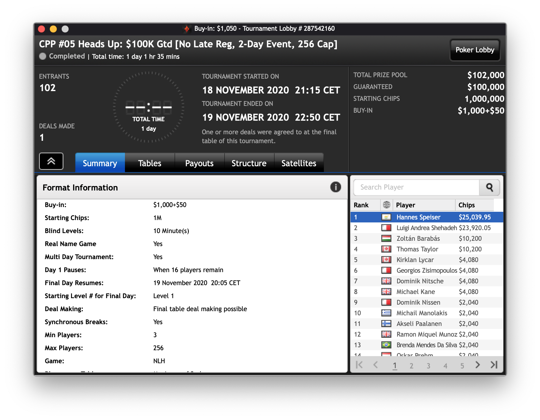 Der Österreicher Hannes Speiser konnte sich gegen 101 Gegner beim CPP #05 $1.050 Heads-Up durchsetzen. Er schnappte sich nach einem Deal mit Luigi Shehadeh den Titel für $25.039, Shehadeh gewann als Zweitplatzierter $23.920.