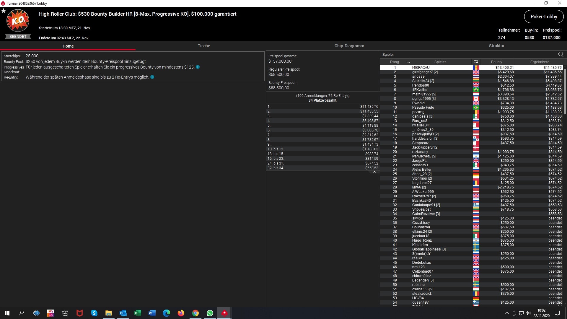 Das Turnier Highlight am Samstag im High Roller Club war das $530 Bounty Builder High Roller Event. Hier bauten 274 Entries einen Preispool von $137.000 auf. Den Titel und $11.435 + $13.406 Bounties sicherte sich Mario „t4t0PAGAU“ Navarro aus Andorra. Bester DACH-Spieler wurde „Ahoo_28“ (GER) auf Platz 25 für $674 + $437 Bounties.
