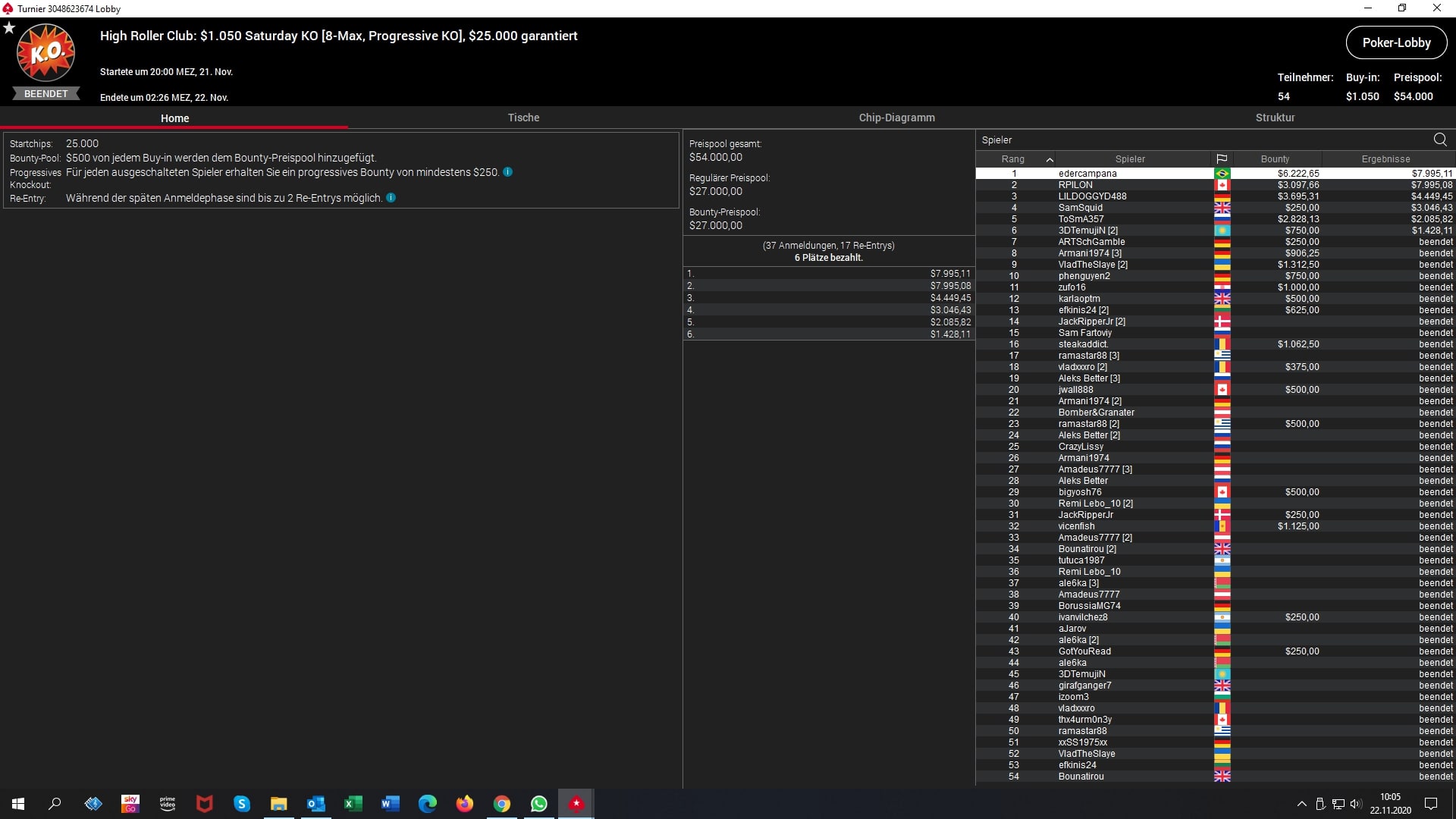 Das $1.050 Saturday KO Event lockte 54 Kopfgeldjäger an. Hier konnte der Brasilianer Eder „edercampana“ Rodrigues Campana triumphieren und $7.995 + $6.222 Bounties gewinnen. „LILDOGGYD488“ aus Deutschland holte sich Platz 3 und $4.449 + $6.222 Bounties.