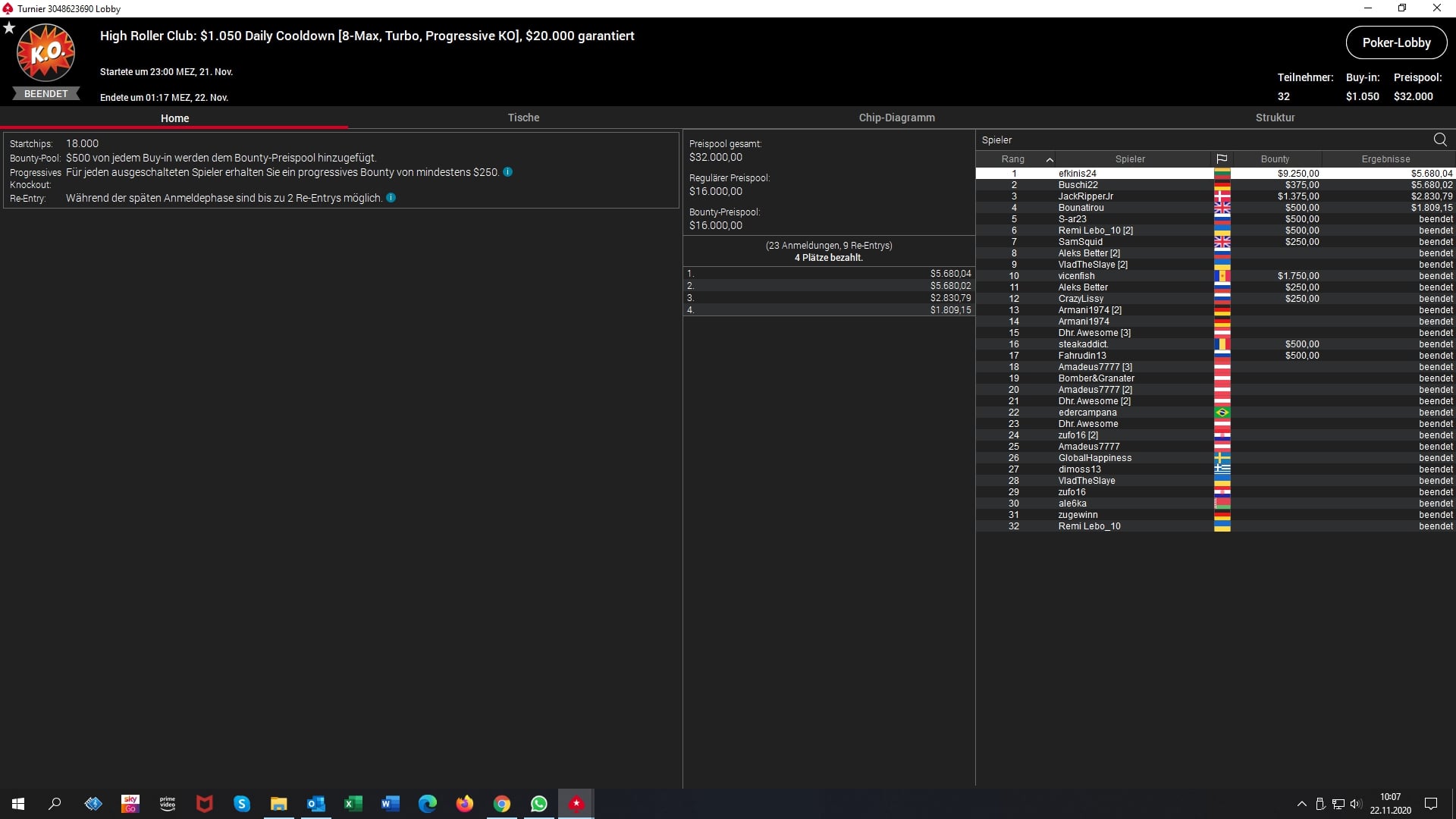 Beim $1.050 Daily Cooldown verpasste der Deutsche „Buschi22“ den Sieg nur knapp und musste sich im Heads-Up dem Litauer „efkinis24“ geschlagen geben. Platz 2 brachte ihm ein Preisgeld von $5.680 + $375 Bounties. „efkinis“ (LTU) kassierte für den Sieg $5.680 + $9.250 Bounties. Dominik „Bounatirou“ Nitsche (GER/GBR) belegte noch Platz 4 für $1.890 + $500 Bounties.