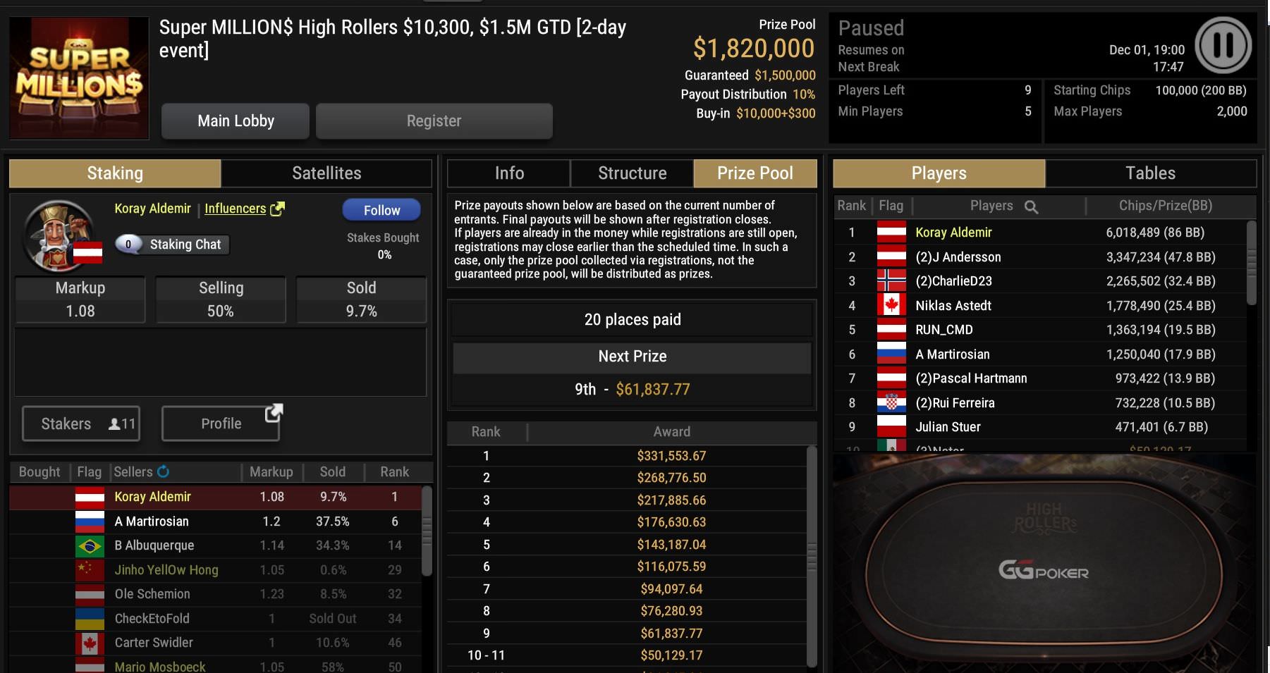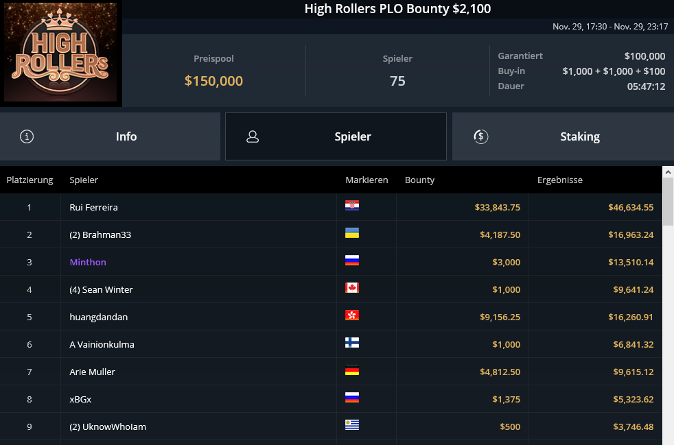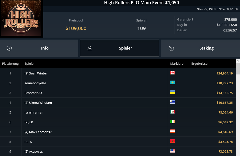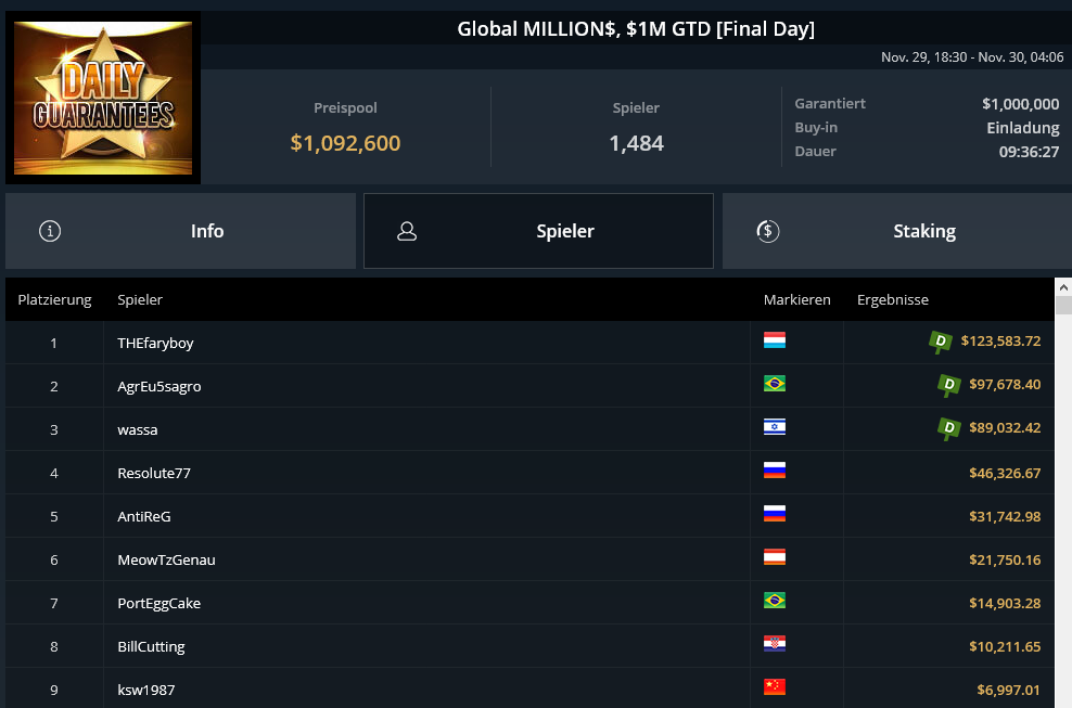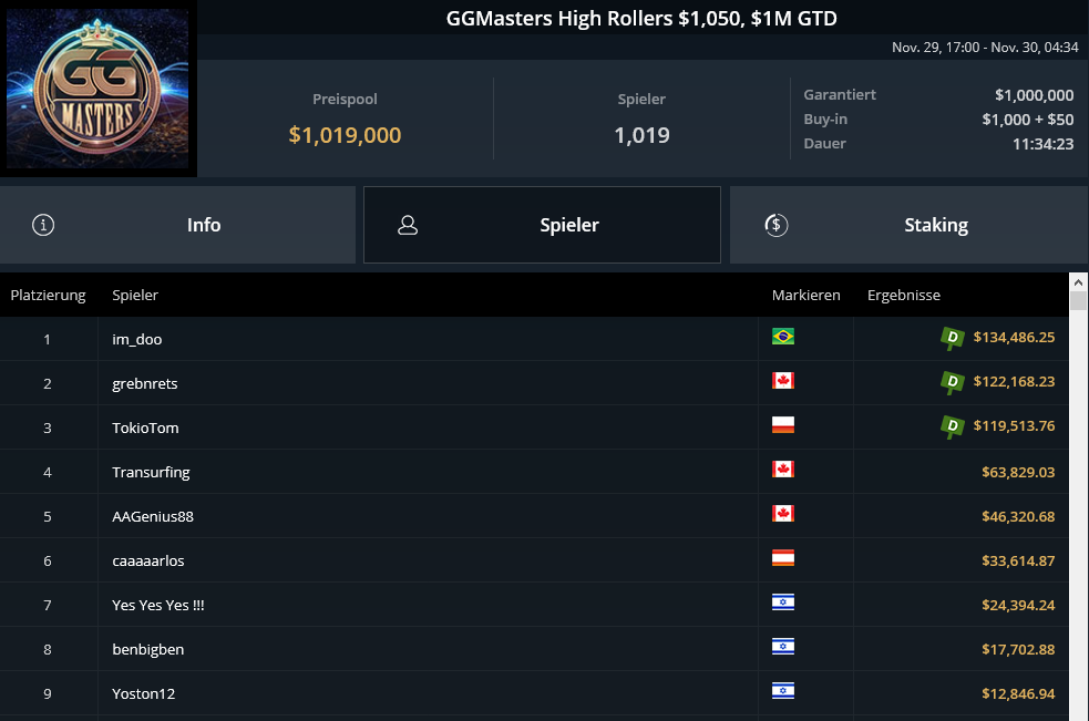 Einen starken sechsten Platz belegte Fabian „MeowTzGenau“ bei den Global MILLION$, was ihm gut $21.000 einbrachte, und „caaaaarlos“ aus Österreich durfte sich für Platz 6 bei den GGMasters gar über gut $33.000 freuen.