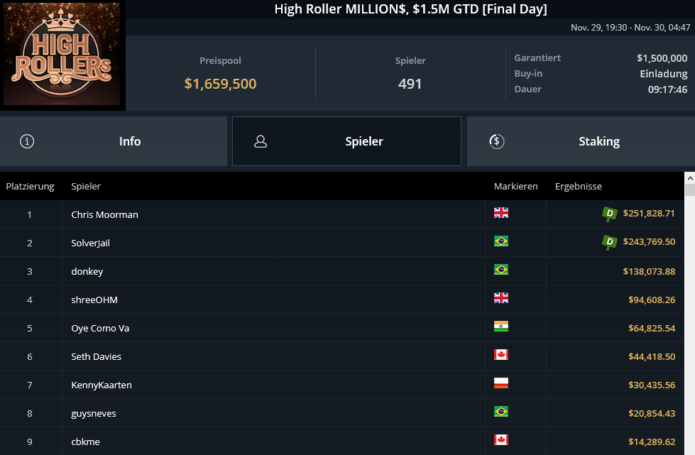 Größter Gewinner des Tages war Chris Moorman, der beim High Roller MILLION$ nach Deal triumphierte und über $251.000 einstrich.