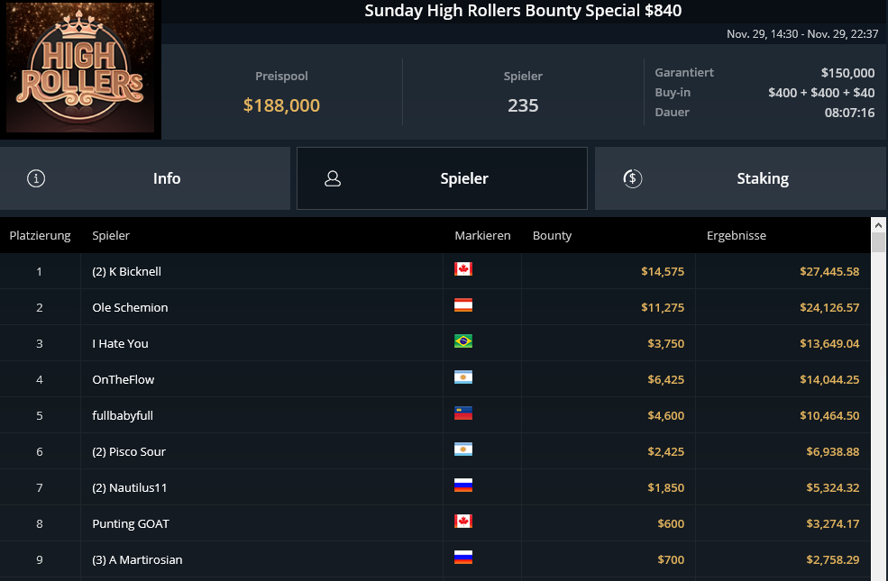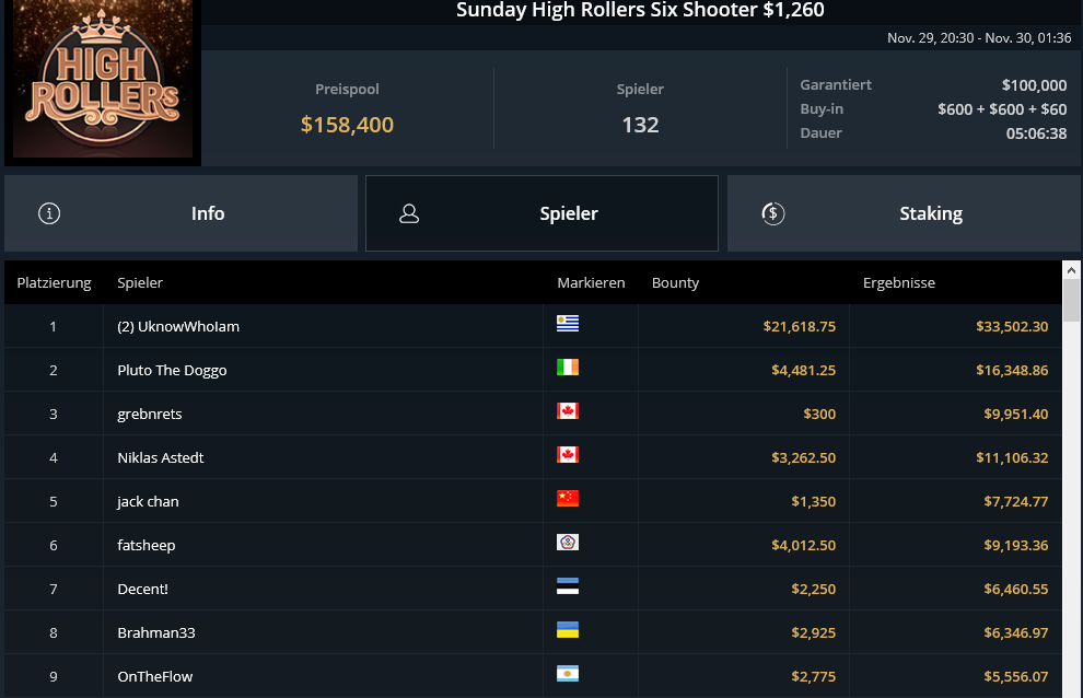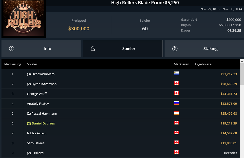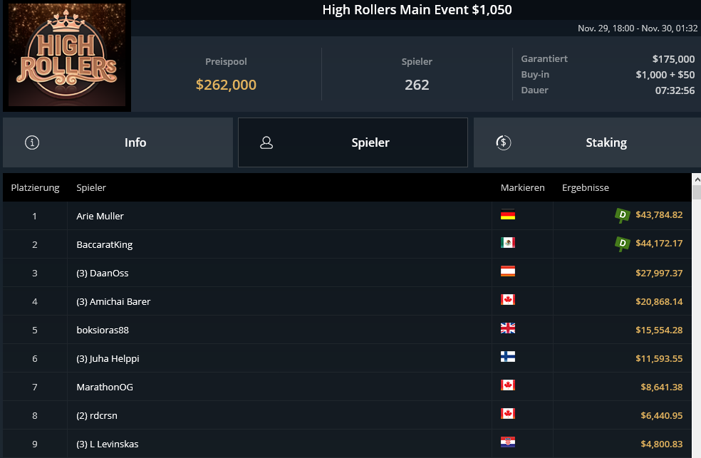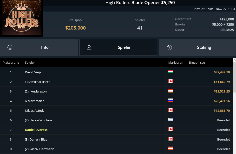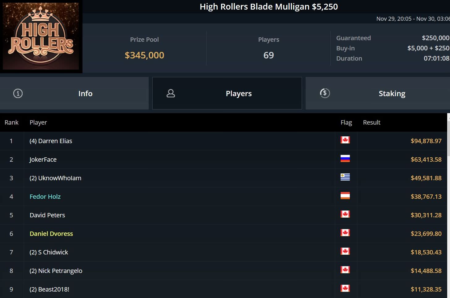 Für weitere starke DACH-Resultate sorgten Fedor Holz mit Platz 4 beim High Rollers Blade Mulligan (gut $38.000 Preisgeld), Pascal Hartmann mit Platz 5 beim High Rollers Blade Prime (gut $25.000 Preisgeld), Stefan Jedlicka mit Platz 4 beim High Roller FAST (knapp $5.000 Preisgeld), Rainer Kempe mit Platz 2 beim High Rollers Cooldown (knapp $13.000 Preisgeld) und Ole Schemion mit Platz 2 beim Sunday High Rollers Bounty Special (gut $24.000 Preisgeld).