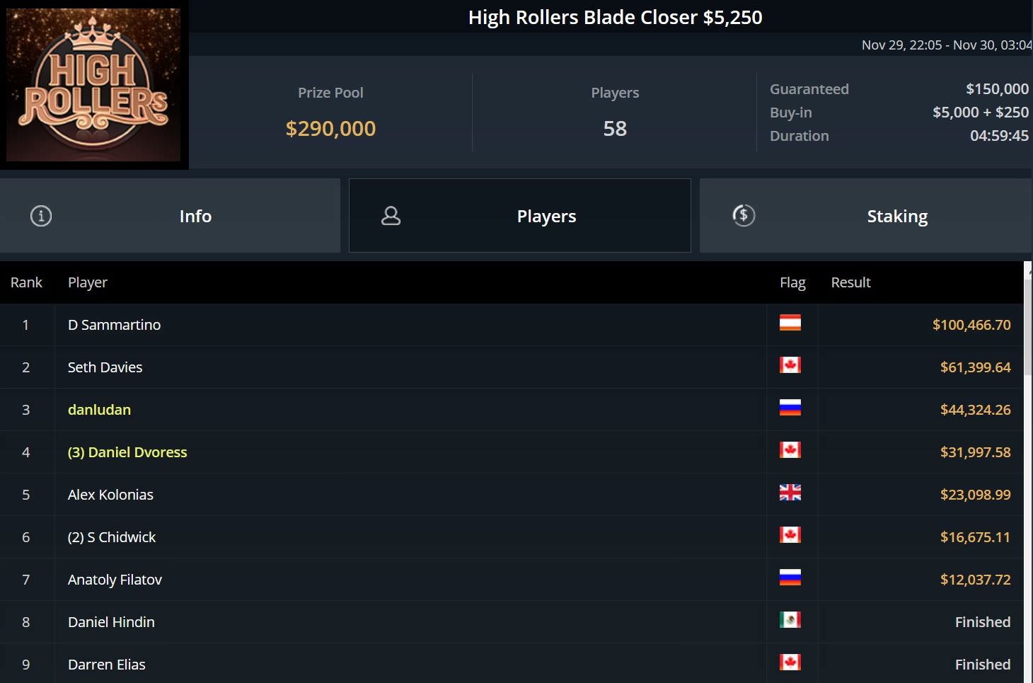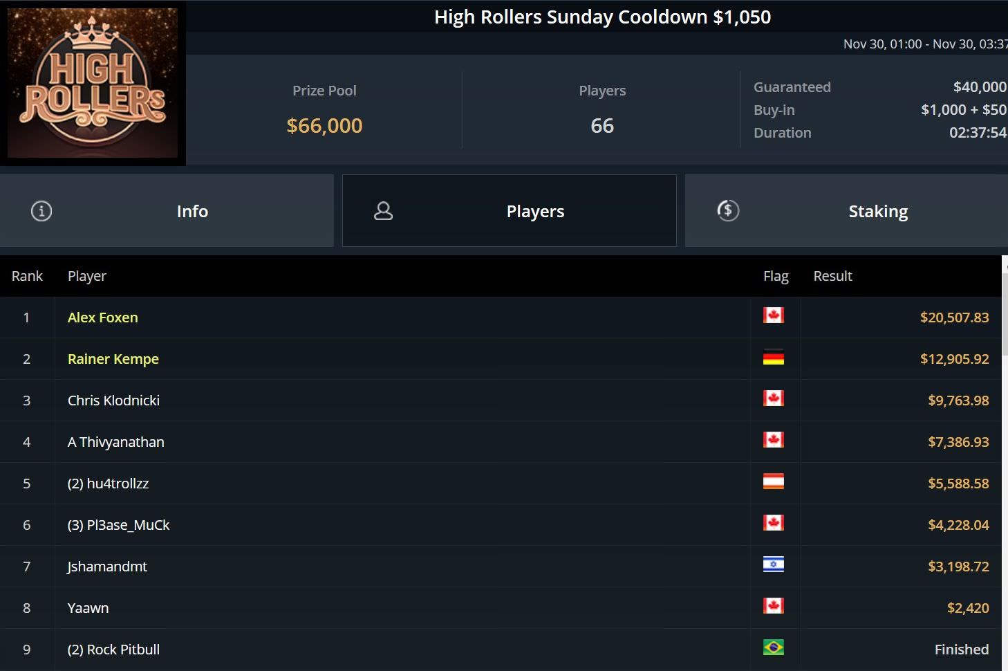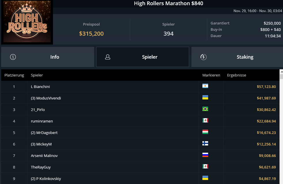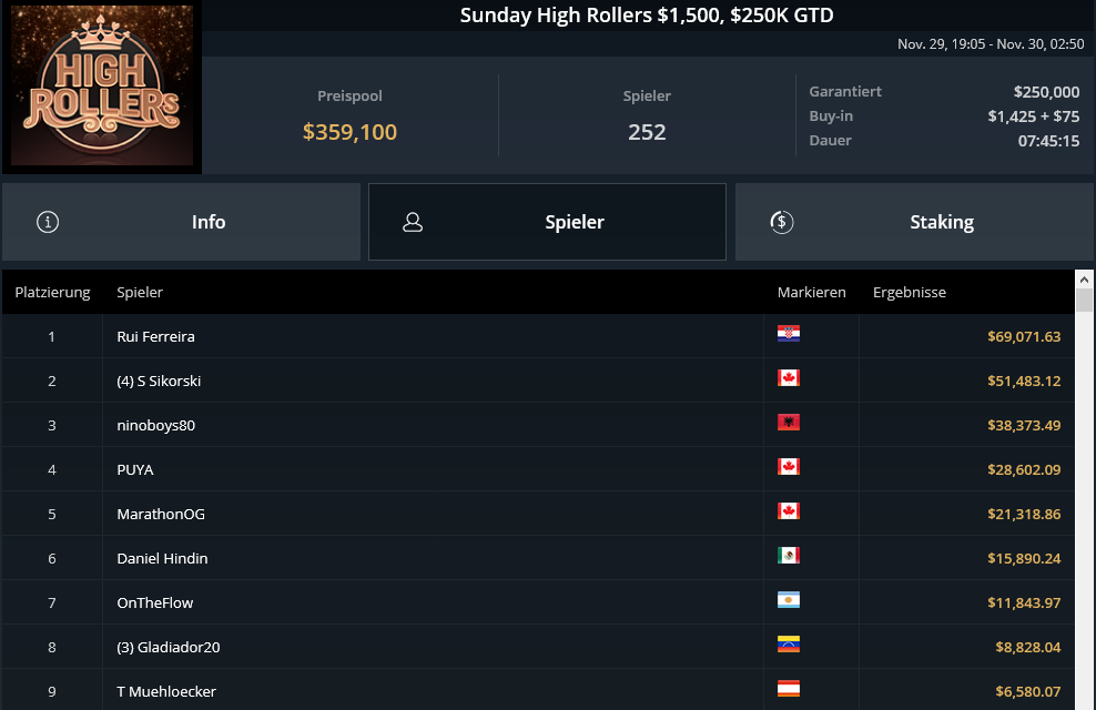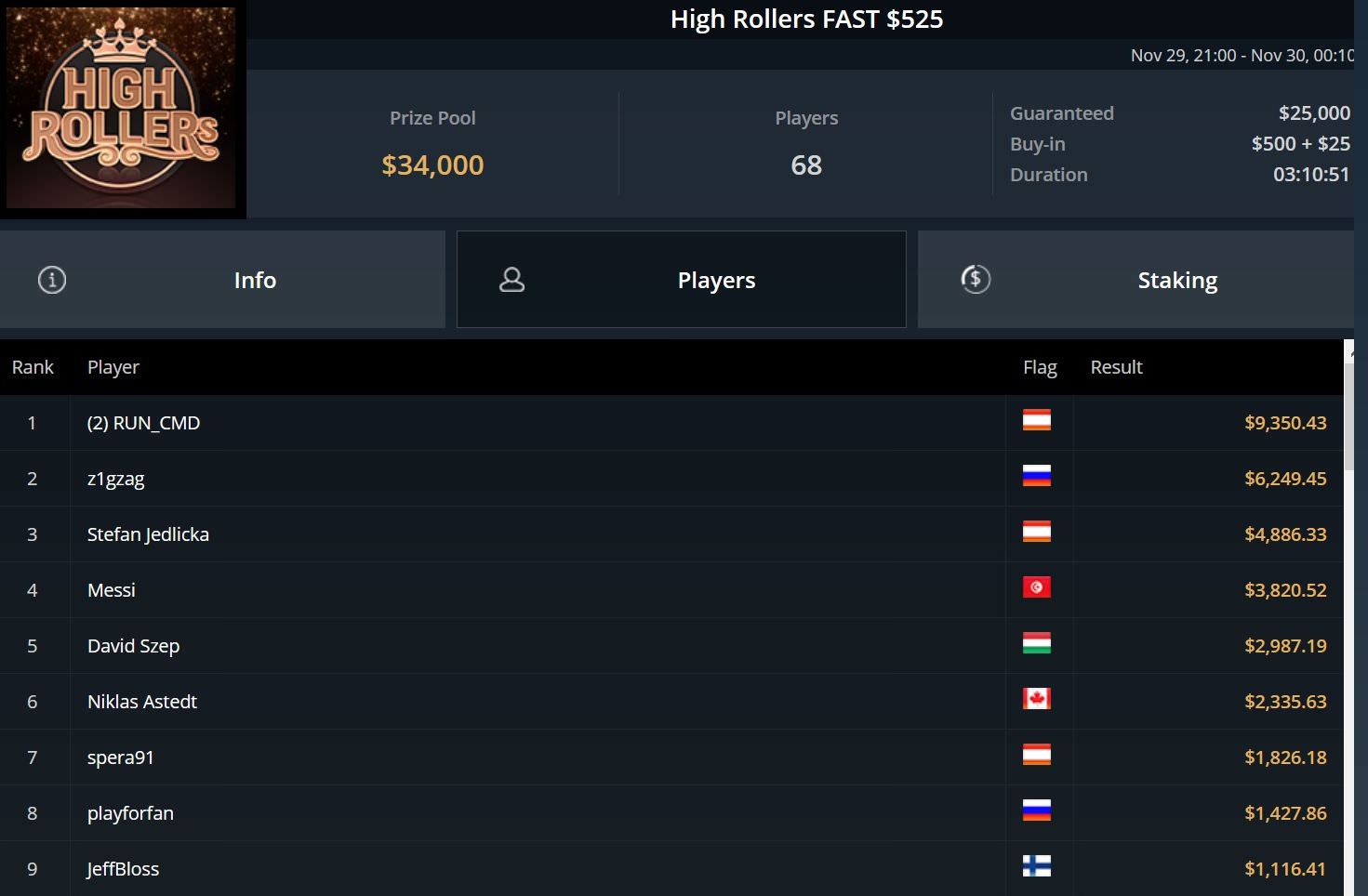 Für weitere starke DACH-Resultate sorgten Fedor Holz mit Platz 4 beim High Rollers Blade Mulligan (gut $38.000 Preisgeld), Pascal Hartmann mit Platz 5 beim High Rollers Blade Prime (gut $25.000 Preisgeld), Stefan Jedlicka mit Platz 4 beim High Roller FAST (knapp $5.000 Preisgeld), Rainer Kempe mit Platz 2 beim High Rollers Cooldown (knapp $13.000 Preisgeld) und Ole Schemion mit Platz 2 beim Sunday High Rollers Bounty Special (gut $24.000 Preisgeld).