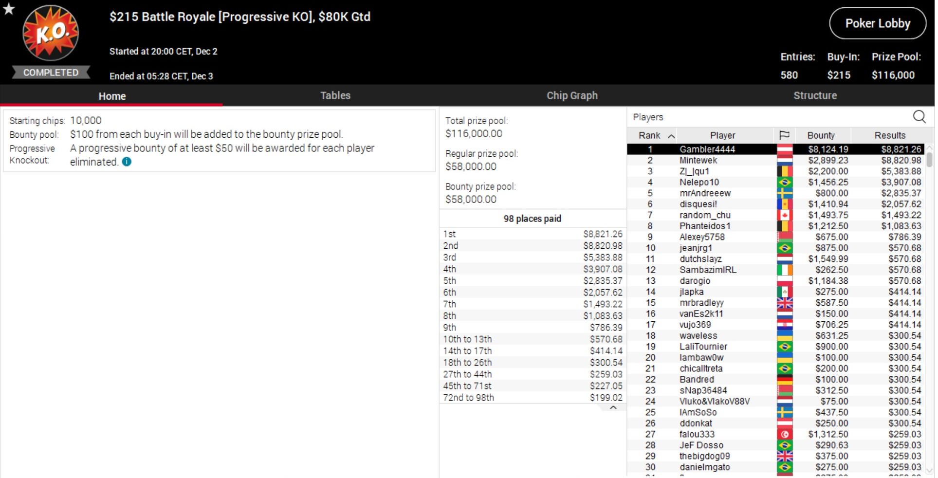 Beim $215 Battle Royale war Christian „Gambler4444“ Nolte unter 580 Startern nicht aufzuhalten und sicherte sich ein Preisgeld von fast $17.000.