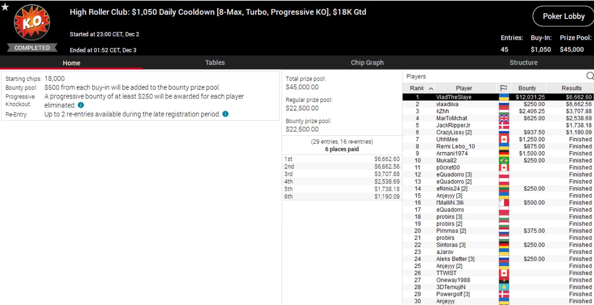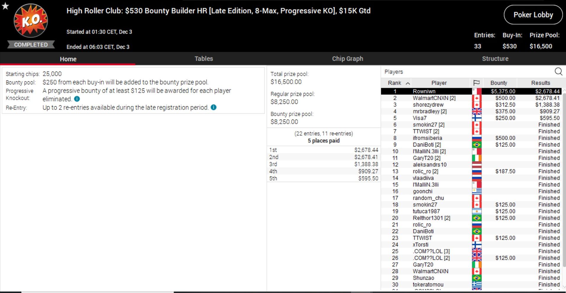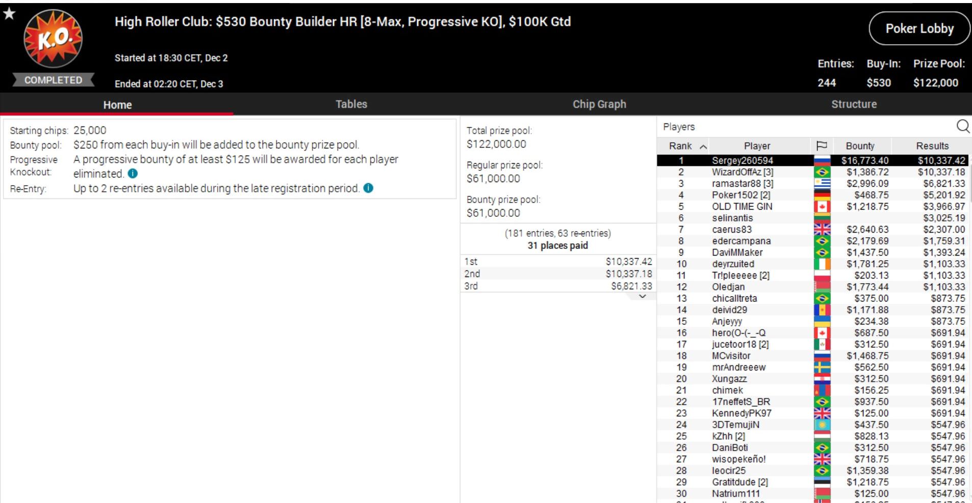 Damit war er aber „nur“ der zweitgrößte Gewinner des Tages, denn „Sergey260594“ aus Russland erhielt für seinen Sieg beim $530 Bounty Builder gegen 243 Konkurrenten sogar über $27.000 Preisgeld. Bester DACH-Spieler war „Poker1502“, der als Vierter rund $5.600 abräumte.