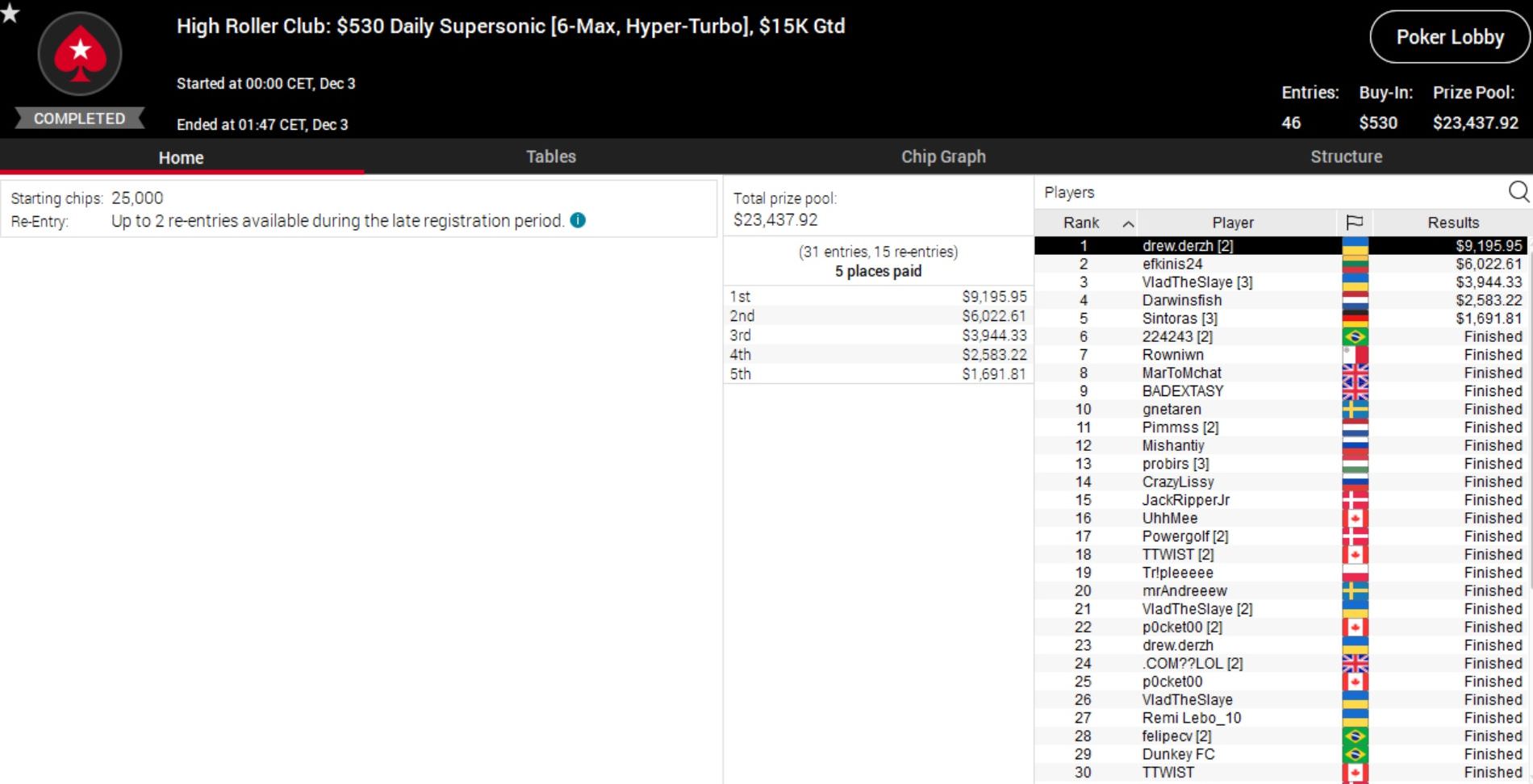 Bei den anderen Turnieren machte wieder einmal „Sintoras“ mit Platz 5 beim $530 Supersonic auf sich aufmerksam. Für den ersten Platz im Geld gab es knapp $1.700.