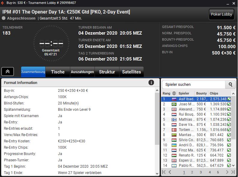 Den Cut geschafft und damit Spieltag 2 am Sonntag um 21:05 Uhr erreicht, haben 27 Spieler. Klar in Führung liegt der Russe Asif Ibadullayev (2.575.348 Chips), dahinter folgt der Brasilianer Joao Baumgarnter (1.369.530).