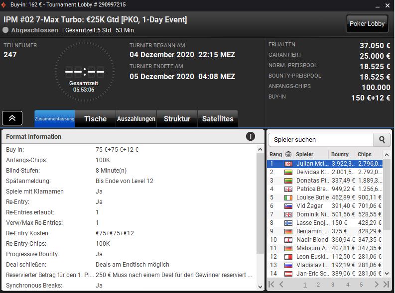 Den ersten Sieg bei den Irish Poker Masters holte der Kanadier Julian Mintosh, der beim €162 NLHE 7-Max Turbo PKO (02) die beiden Litauer Deividas Kvaselis (€2.792,09/€2.001,57) und (€1.889,32/€337,49) sowie den Deutschen Patrice Brandt (€1.256,67/€949,22) auf die Plätze verwies und neben €2.796,01 Prämie zusätzlich €3.922,33 an Bounties abräumte.