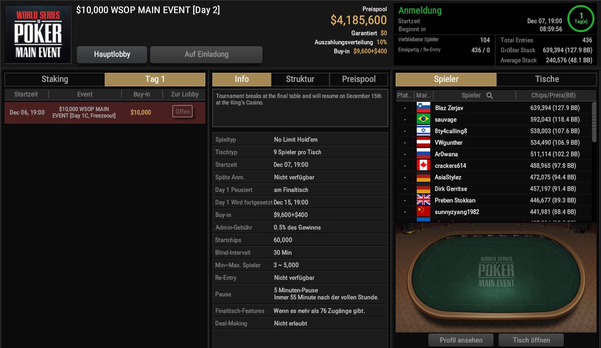 Weiter geht es heute Abend um 19 Uhr mit Starttag 1. Spieltag 2 beginnt dann am Montag um 19 Uhr und wird bei noch neun Spielern pausiert, denn der Final Table wird erst am Dienstag, dem 15. Dezember gespielt.