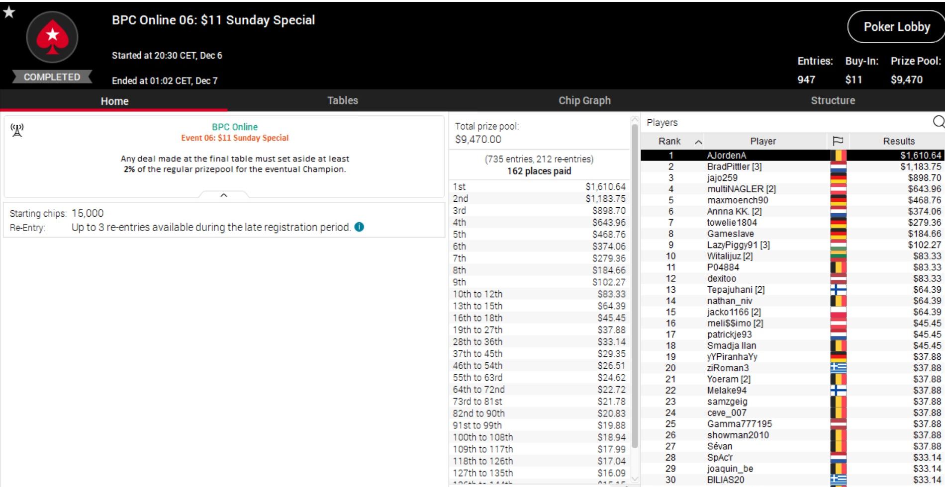 Beim Side Event, dem $11 Sunday Special, schaffte “AJordenA “ unter 947 Startern einen Heimsieg.