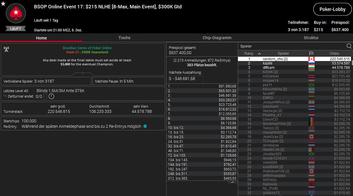 Wann es heute weiter geht ist noch nicht offiziell bestätigt, höchstwahrscheinlich aber um 21 Uhr. Der Kanadier random_chu führt klar vor dem Russen kaziiiii und dem Bulgaren diffsam. Der Österreicher mojave14 musste sich auf Platz sechs für $16.912,32 geschlagen geben, der US-Amerikaner Chris ImDaNuts Oliver auf Platz fünf für $23.725,49.