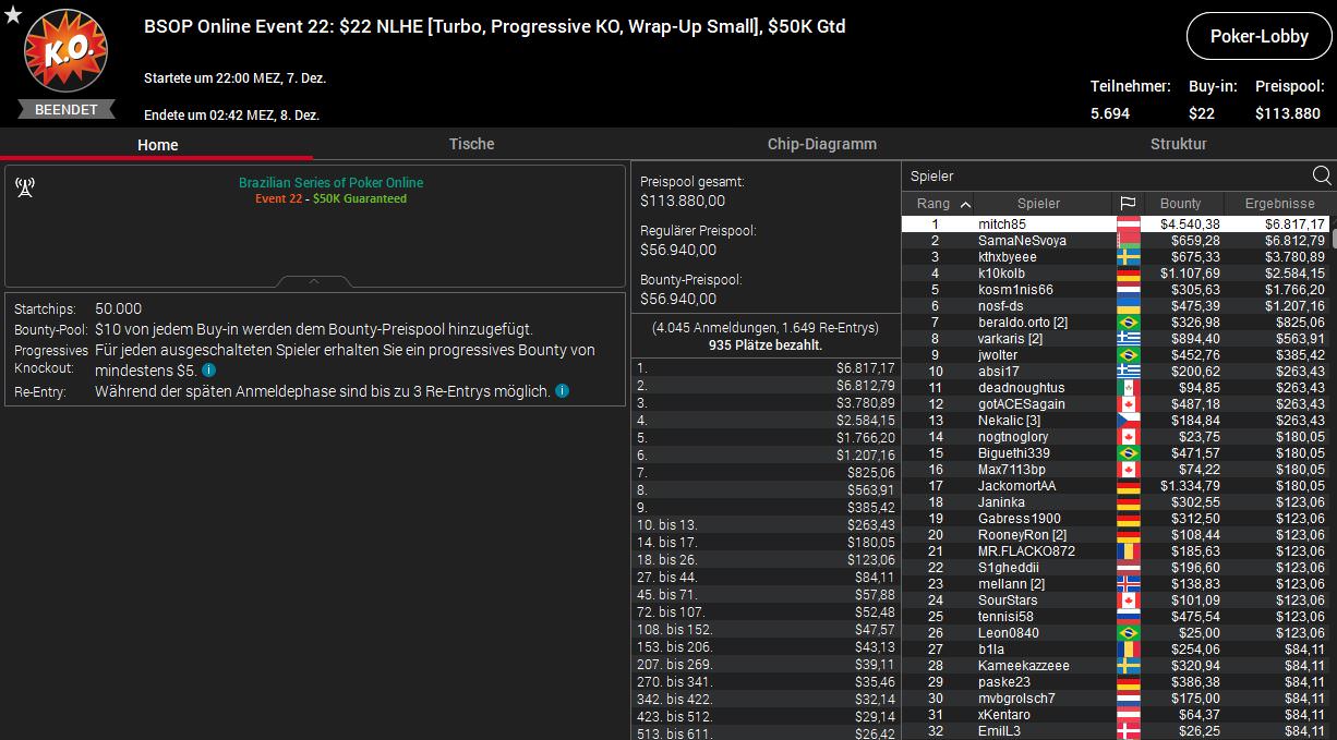 Beim $22 NLHE Wrap-Up Small wurde durch 5.694 Entries ein Preispool in Höhe von $113.880 erreicht und der Sieg ging an den Österreicher mitch85, der sich nicht nur $6.817,17 Prämie erspielte, sondern zusätzlich auch noch $4.540,38 an Bounties einsammelte. Der Deutsche k10kolb wusste ebenfalls zu überzeugen, bekam als Vierter $2.584,15 plus $1.107,69 ausbezahlt.