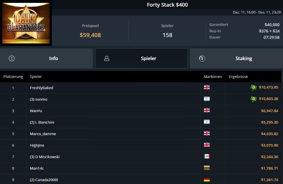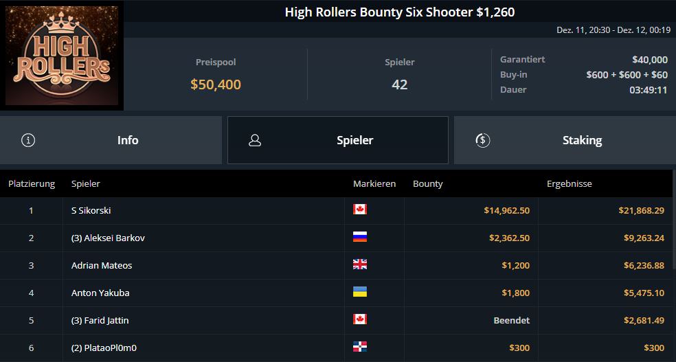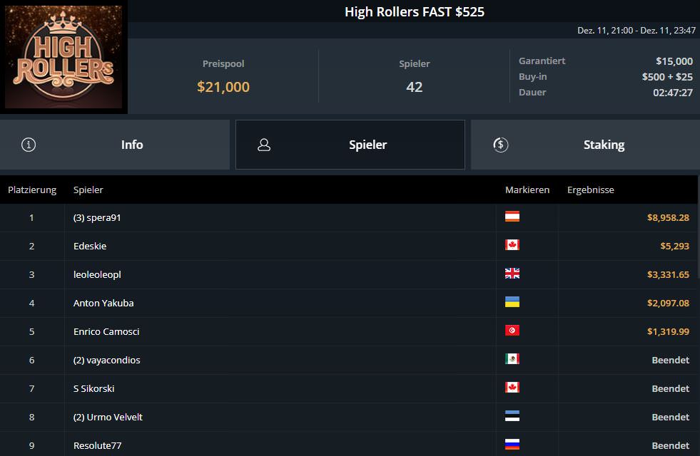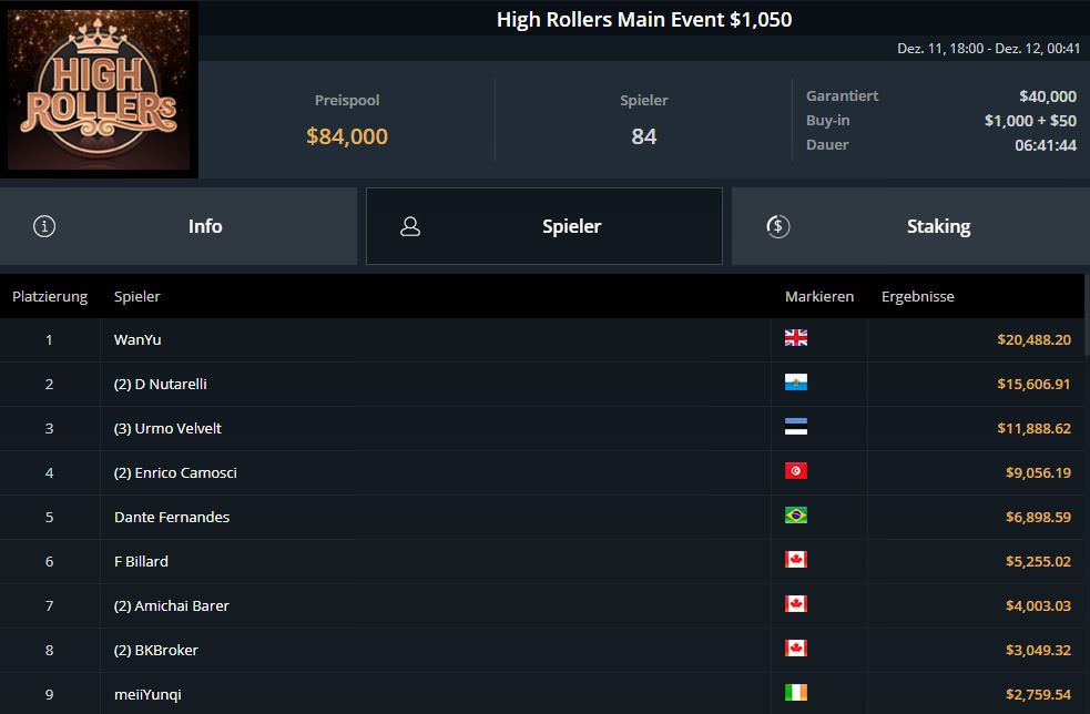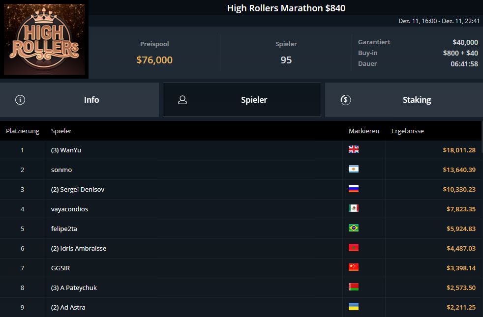 Spieler des Tages war aber definitiv WanYu aus Großbritannien. Er begann mit dem Sieg für satte $18.011,28 beim $840 High Rollers Marathon, schloss danach das $400 Forty Stack auf Platz drei für $6.947,84 ab. Nach Mitternacht legte WanYu noch eine Schippe drauf, indem er auch den $1.050 High Rollers Main Event zu seinen Gunsten entschied und weitere $20.488,20 ausbezahlt bekam.