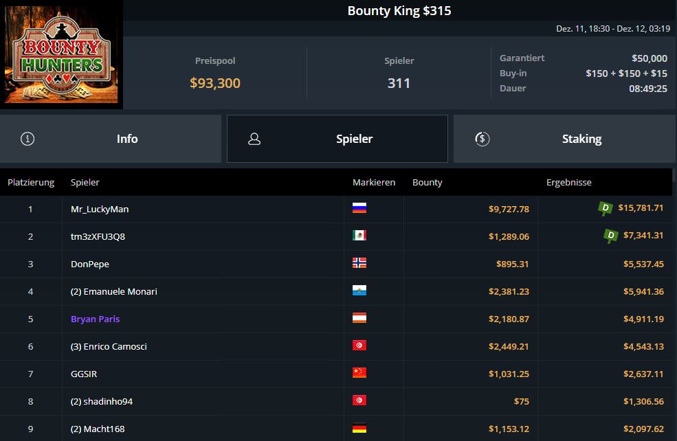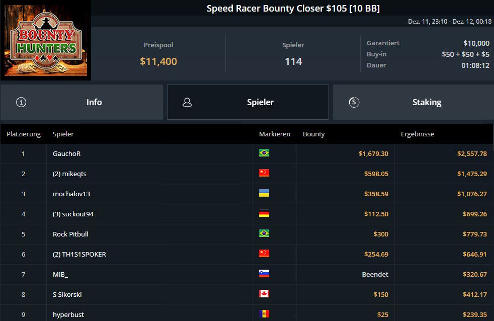 Die Ergebnisse der deutschsprachigen Spieler auf GGPoker waren am Freitag übersichtlich. Den größten Erfolg feierte DirCOOLes beim $52,50 Bounty Hunters Daily Main. Bei 1.718 Entries wurden insgesamt $85.900 ausgespielt, der Deutsche sicherte sich für den Sieg $8.285,74 Prämie und sammelte zusätzlich $4.750,18 an Bounties ein.