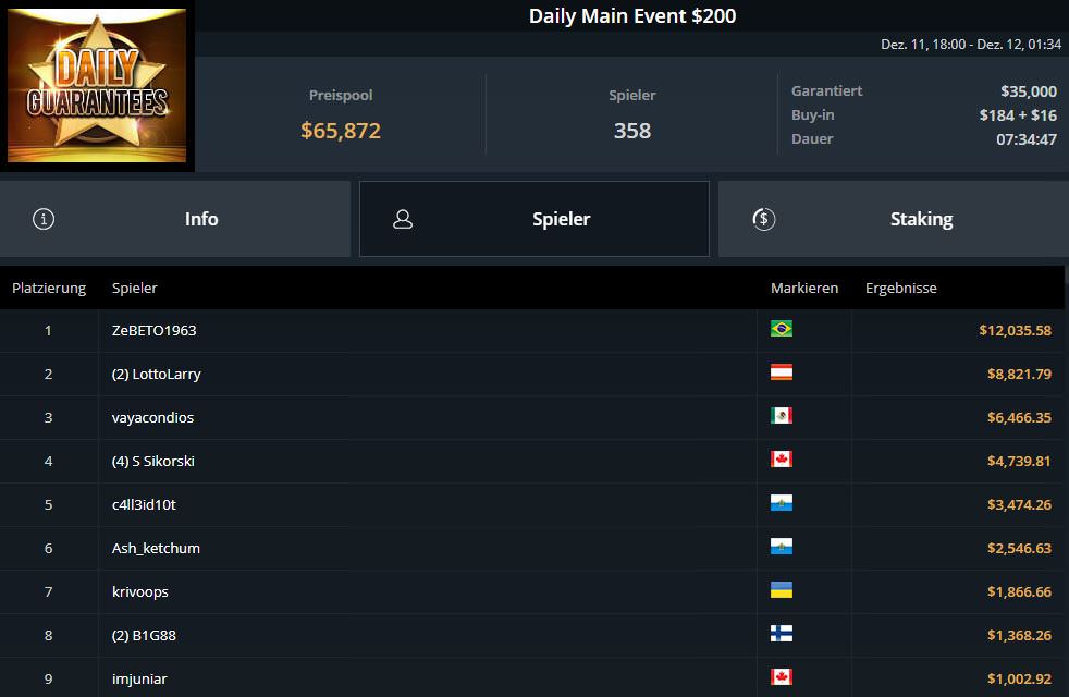 Leonard LottoLarry Maue aus Österreich verpasste einen Sieg beim $200 Daily Main Event haarscharf. Bei 358 Entries ging es um $65.872 an Preisgeldern, Maue bekam als Runner-up $8.821,79 ausbezahlt, der Brasilianer ZeBETO1963 als Sieger $12.035,58.