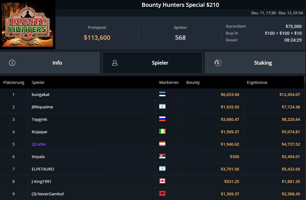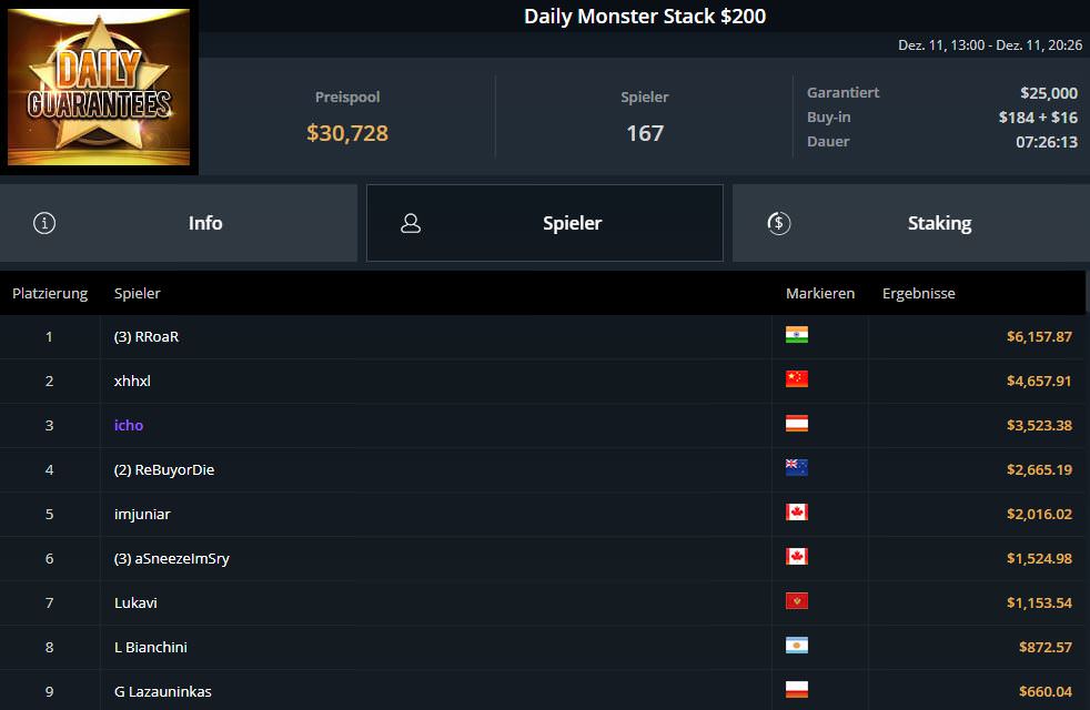 Streamer icho aus Österreich, hatte ebenfalls eine gute Session. Er belegte beim $200 Daily Monster Stack einen starken dritten Platz für $3.523,38 Preisgeld, schloss zudem das $210 Bounty Huters Special auf Platz fünf für insgesamt $4.737,52 ab.