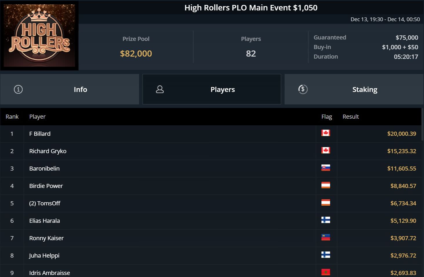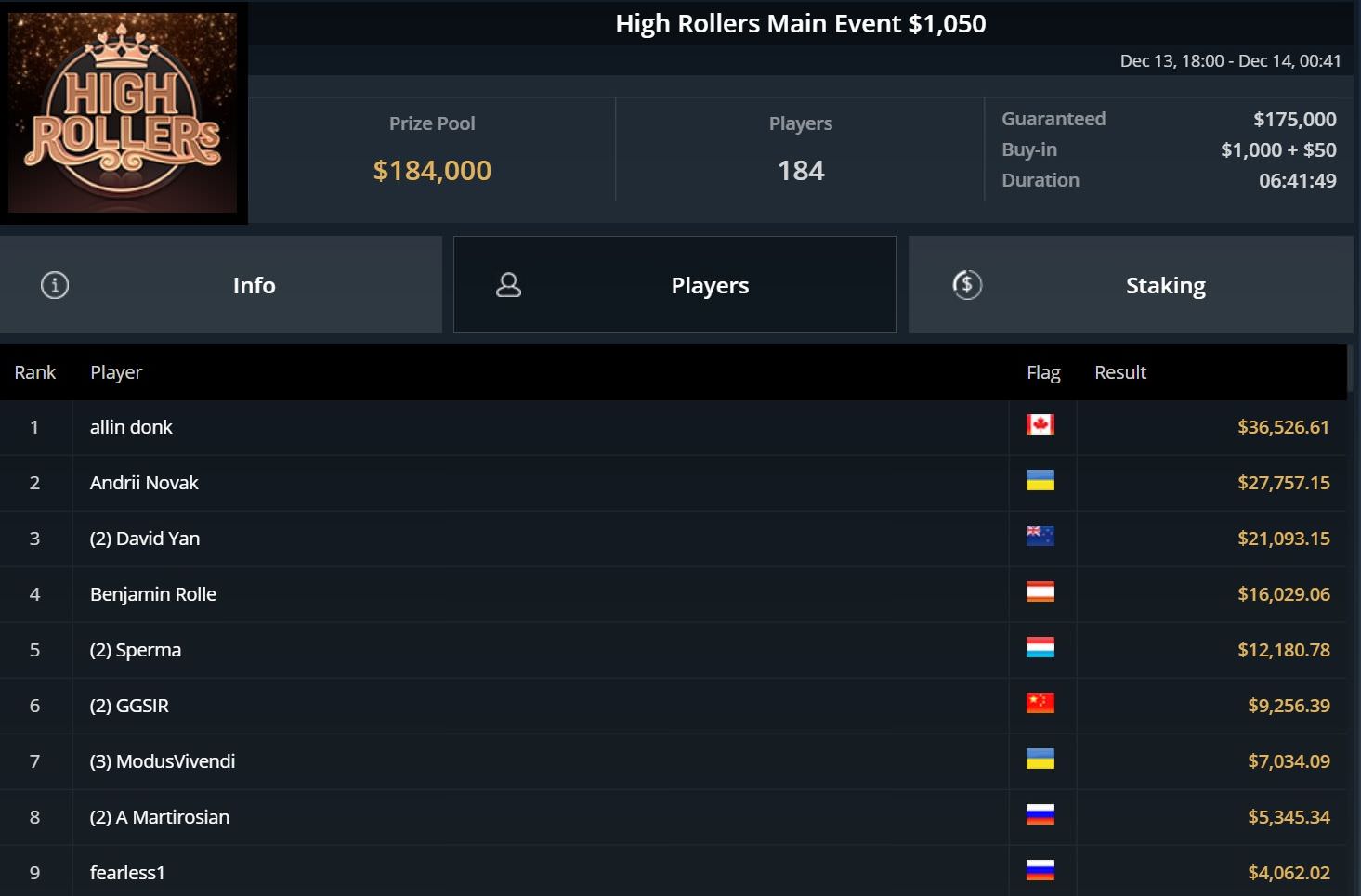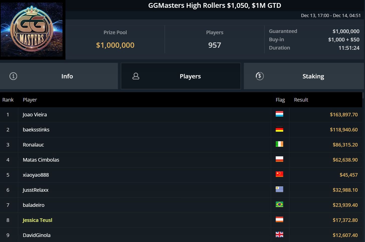 Am Ende reichte es für Platz 2 und $119.000 Preisgeld hinter dem Portugiesen Joao Vieira, der $164.000 kassierte.