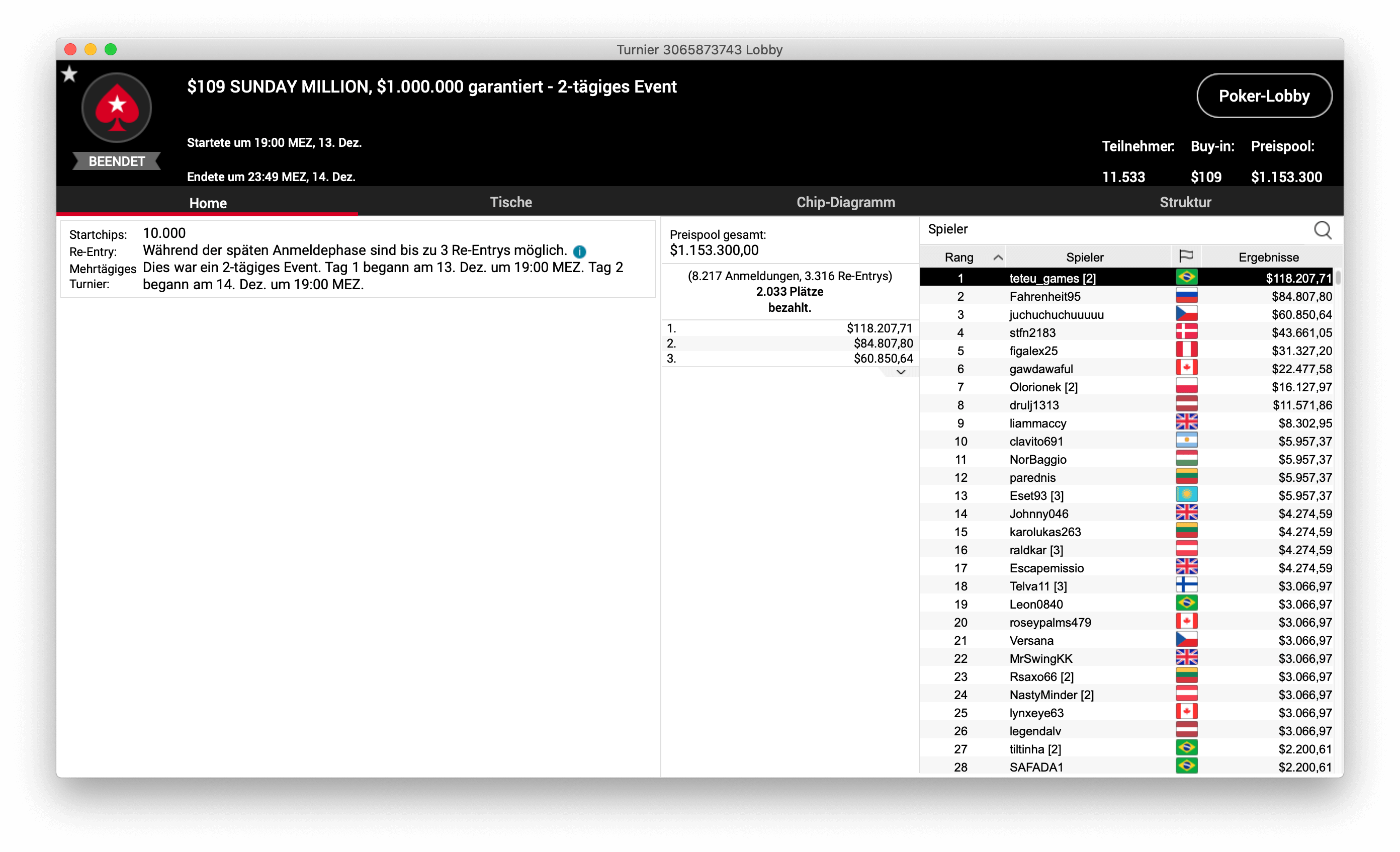 Beim Sunday Million setzte sich „teteu_games“ mit seiner zweiten Bullet durch. Der Brasilianer konnte $118.207 für den Sieg des größten Sunday Majors einsacken.