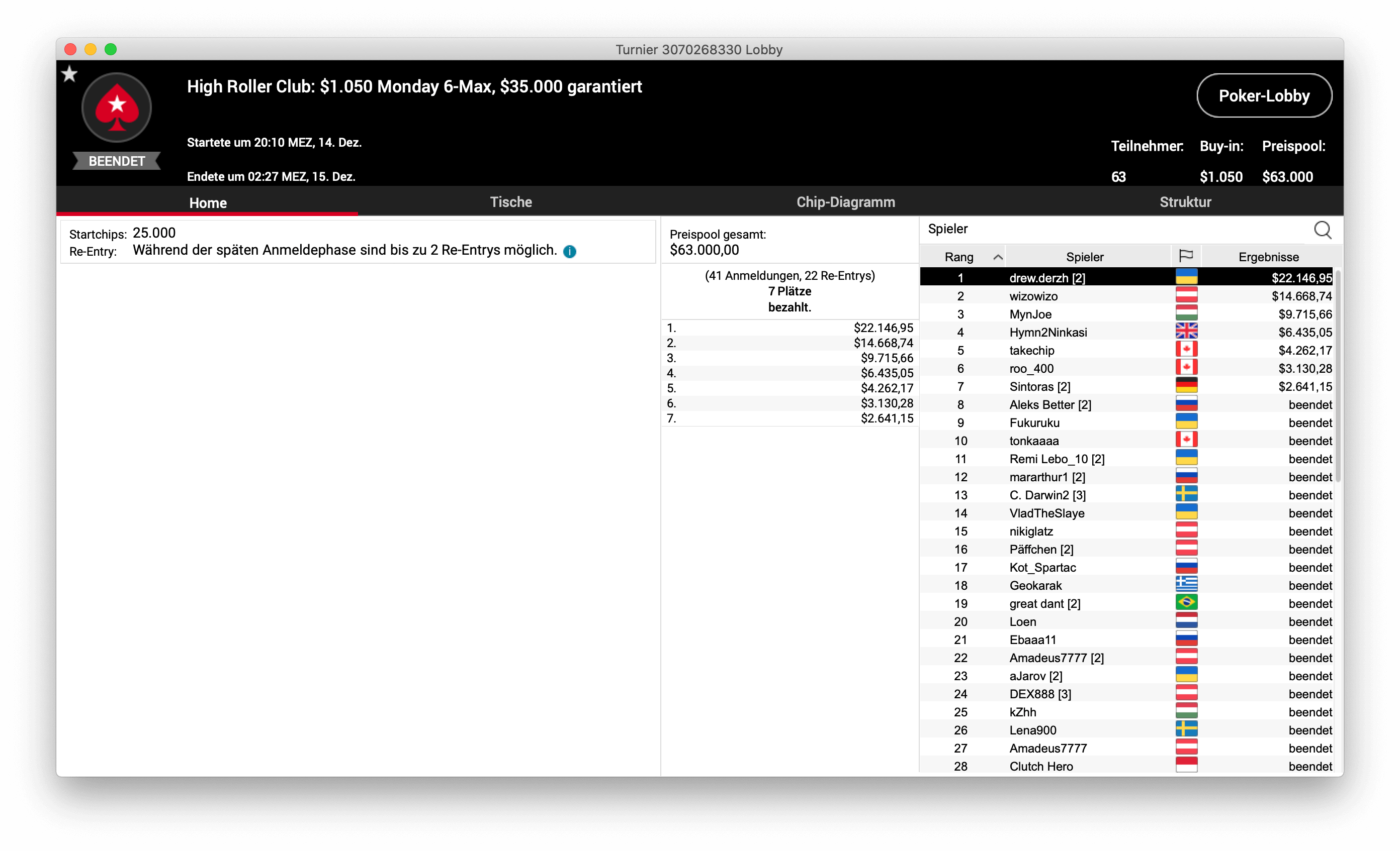 Ole Schemion verpasste den Sieg beim $1.050 Monday 6-Max nur knapp. Er setzte sich gegen 60 gegnerische Entries durch, musste sich aber am Ende dem Ukrainer „drew.derzh“ geschlagen geben. Schemion bekam für den Runner-Up $14.668, für den Sieger gab es $22.146.
