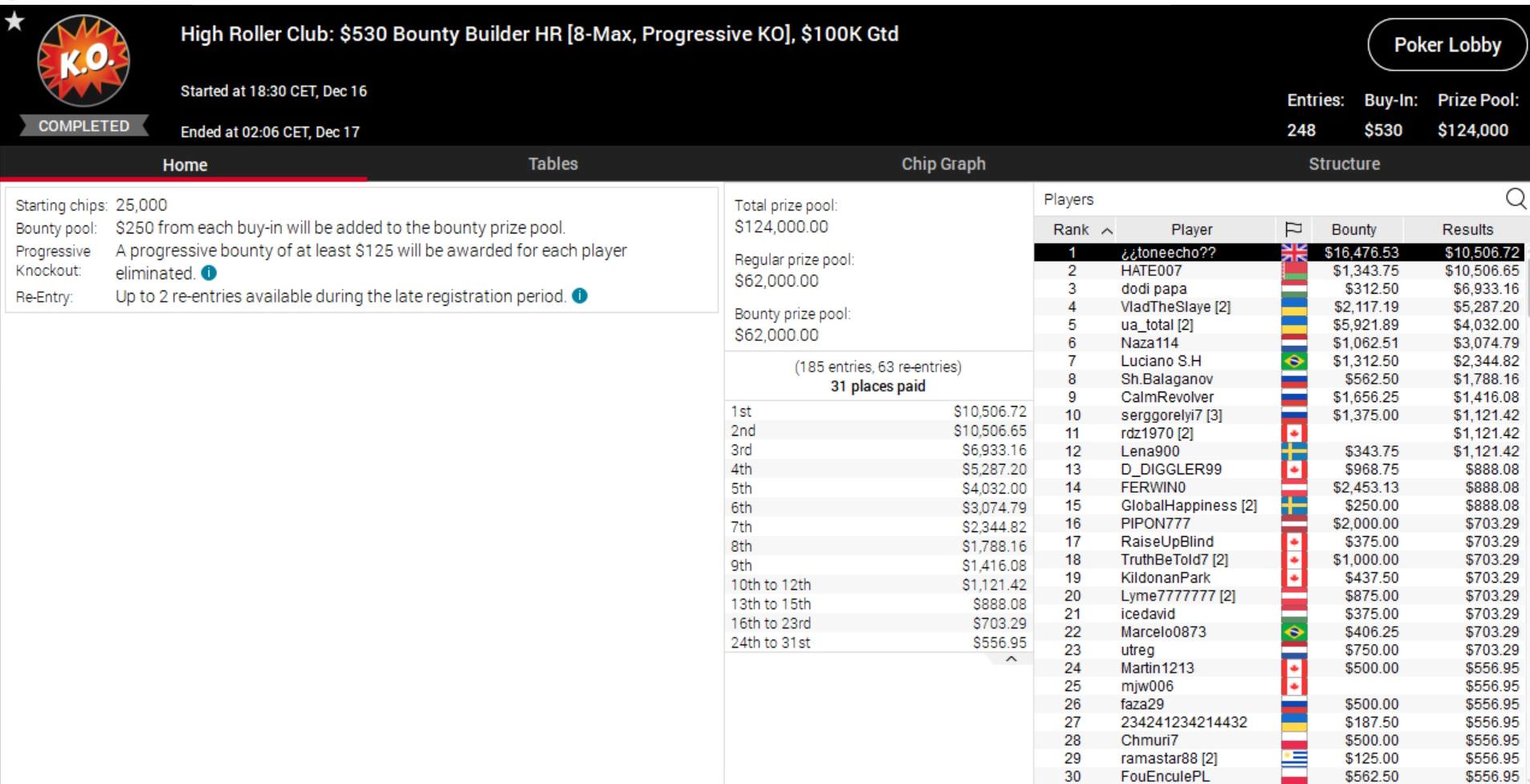 Größter Gewinner des Tages war der Brite „¿¿toneecho??“, der das $530 Bounty Builder für sich entschied.
