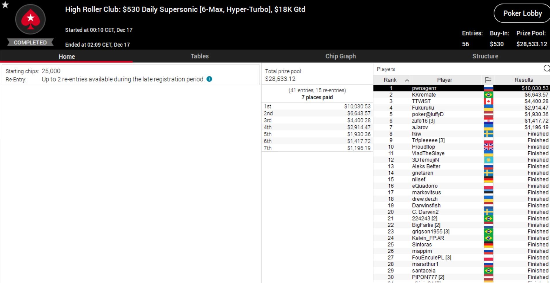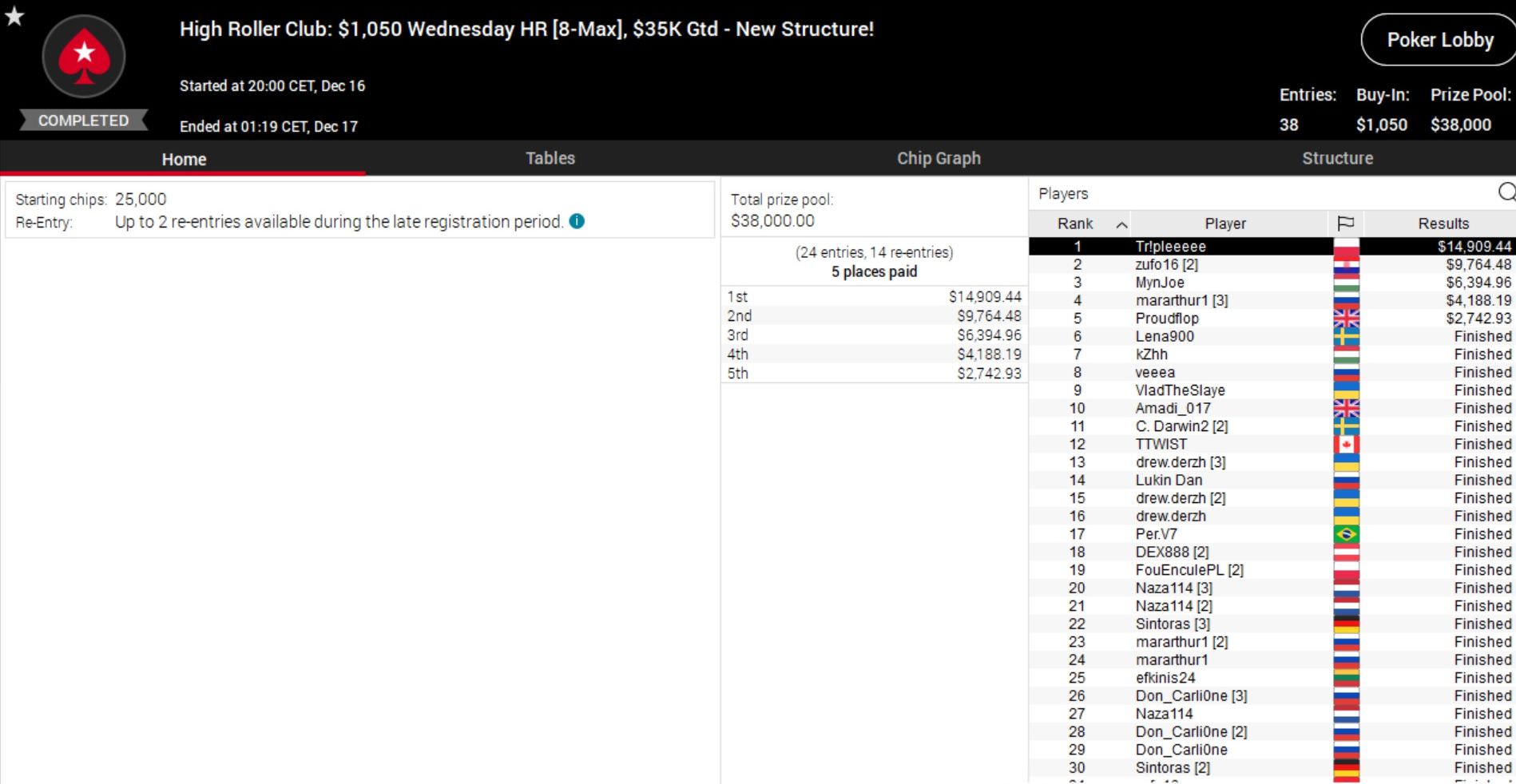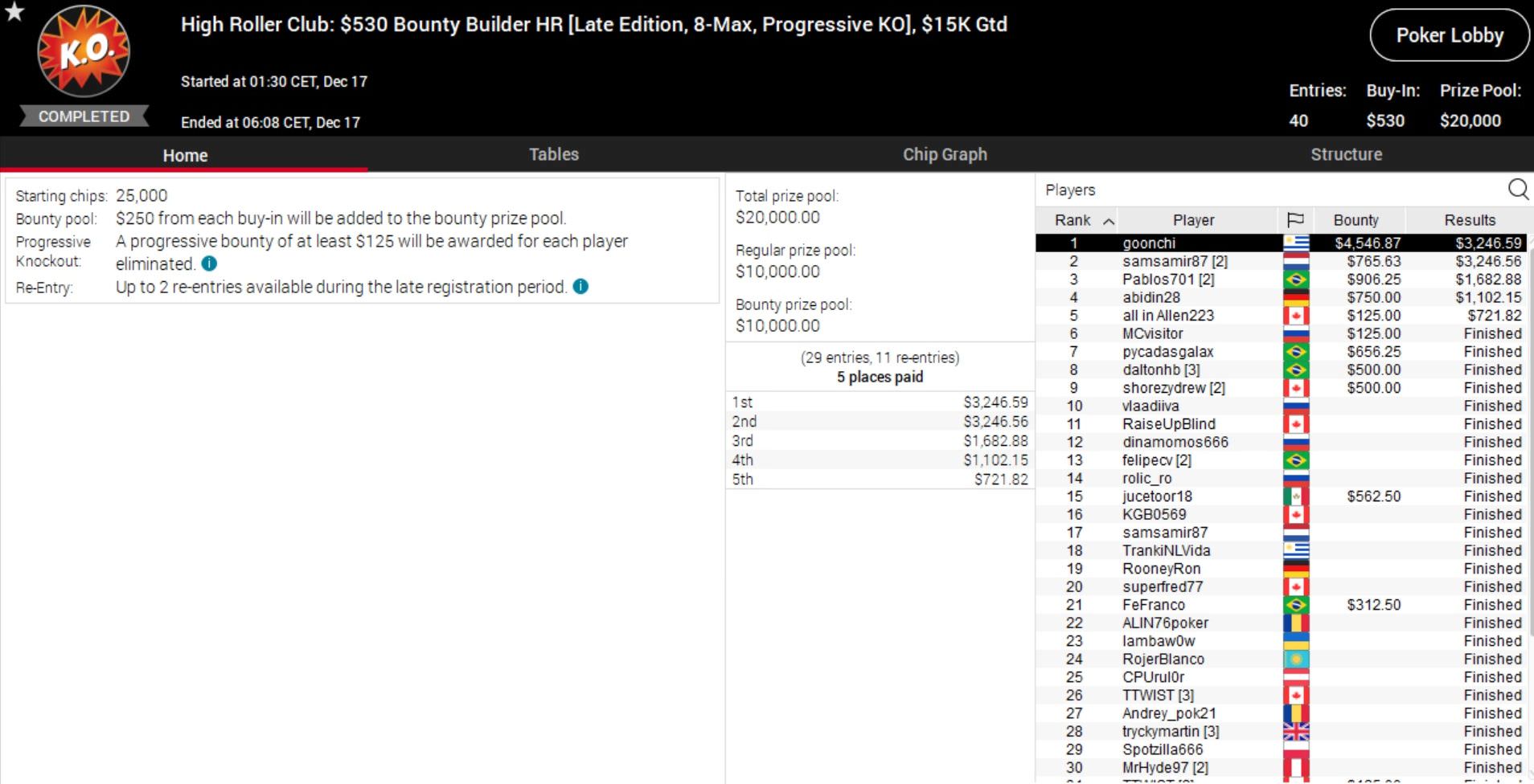 Zum Abschluss des Turniertages konnte dann noch „abidin28“ aus Deutschland einen vierten Platz beim $530 Bounty Builder Late Edition erringen. Er erhielt dafür knapp $2.000, Sieger „goonchi“ aus Uruguay durfte sich über rund $8.000 freuen.