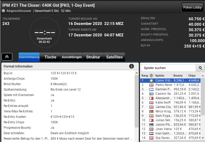 Ole Schemion ging als Elfter in die Entscheidung und landete auf Platz 12, was ihm den Mincash von gut €10.000 einbrachte.