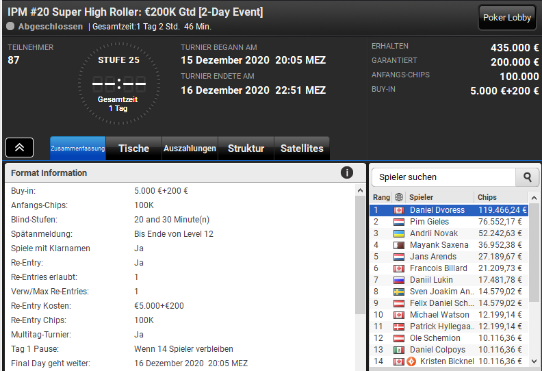 Den Sieg und knapp €120.000 holte Daniel Dvoress, der im Heads-Up den Niederländer Pim Gieles niederrang.