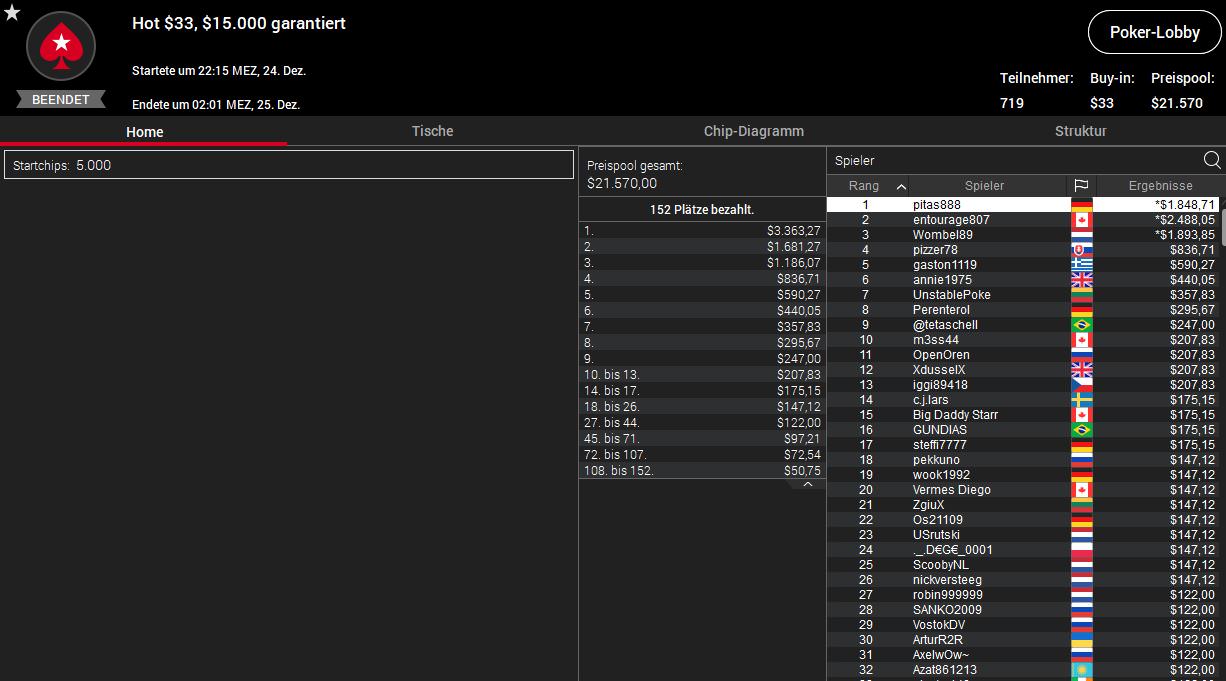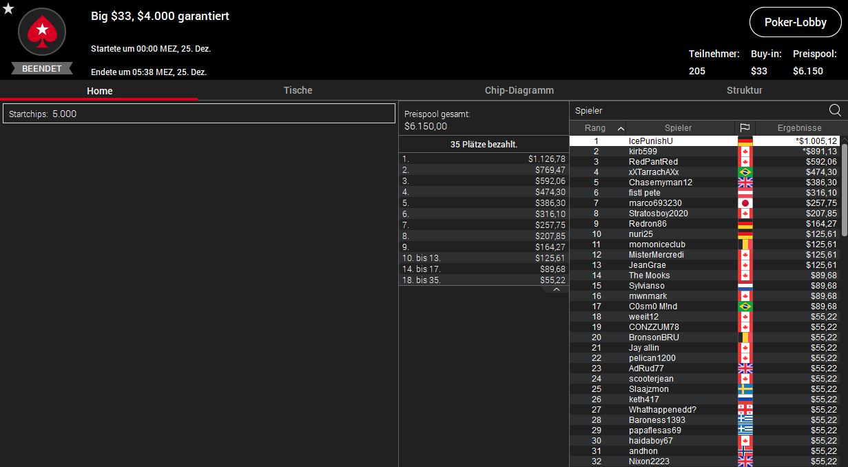 IcePunishU machte nach einem Heads-up-Deal den Sieg beim Big $33 klar, kassierte $1.005,12 Weihnachtsgeld.