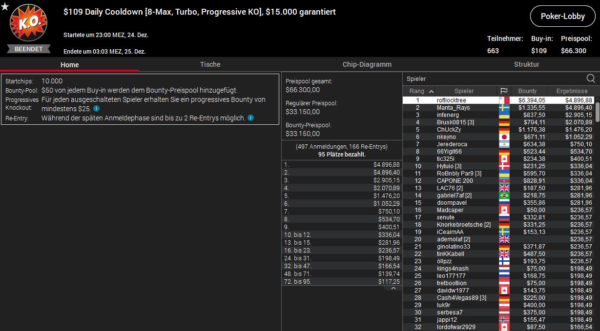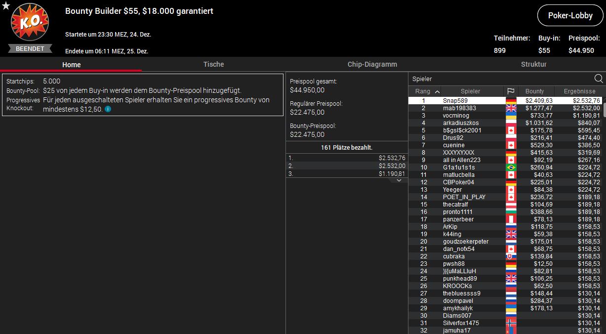 Turniersiege gab es für deutsche Spieler aber auch, drei Stück an der Zahl. Snap589 gewann das Bounty Builder $55 für $2.532,76 plus $2.409,63.
