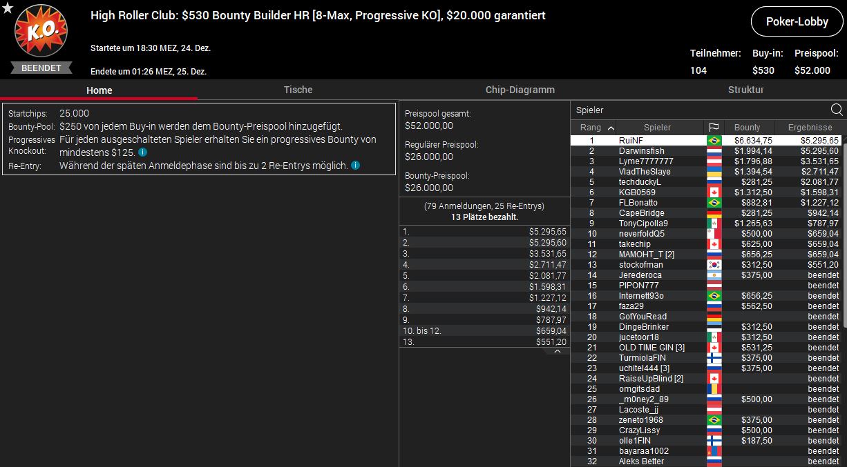 Bei PokerStars wurde an Heiligabend das Programm im High Roller Club deutlich herunter gefahren, mit dem Bounty Builder HR und dem Thursday Thrill wurden nur zwei Turniere absolviert. Ansonsten hatten die Spieler die freie Auswahl zwischen den zahlreichen regulären Dailys.