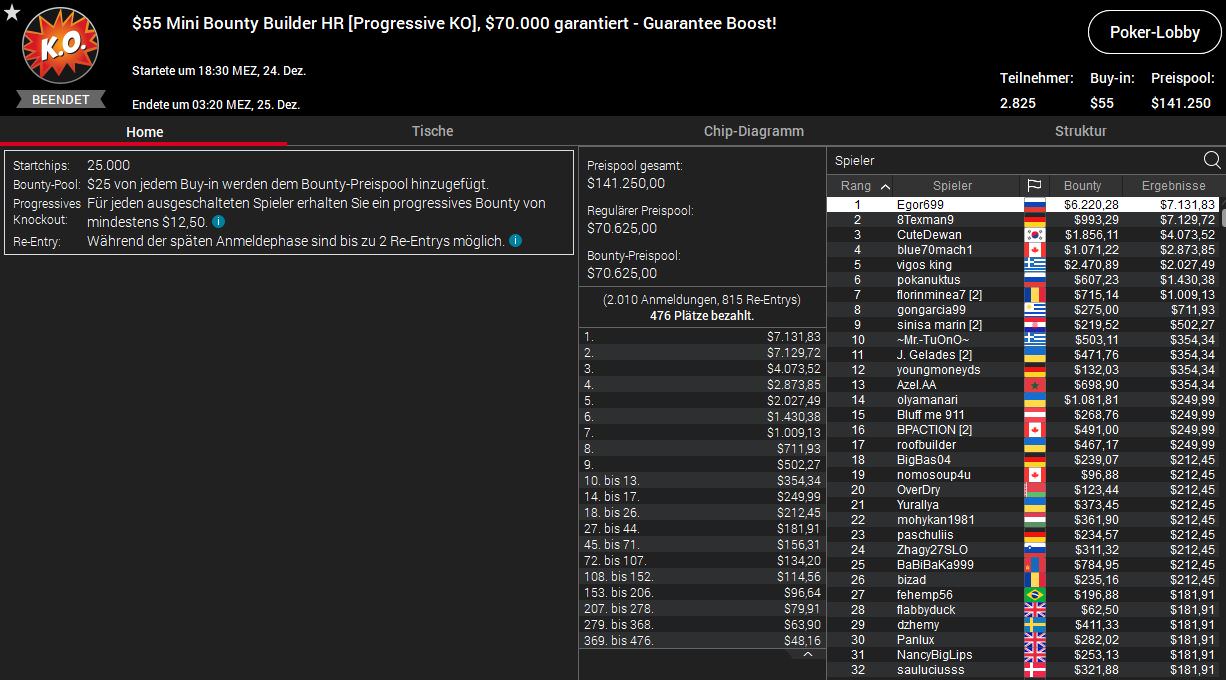 Beim $55 Mini Bounty Builder HR wurden bei 2.825 Entries $141.250 ausgespielt. Der Deutsche 8Texman9 verpasste den Sieg nur haarscharf, bekam als Runner-up aber $7.129,72 Preisgeld plus $993,29 an Bounties ausbezahlt.