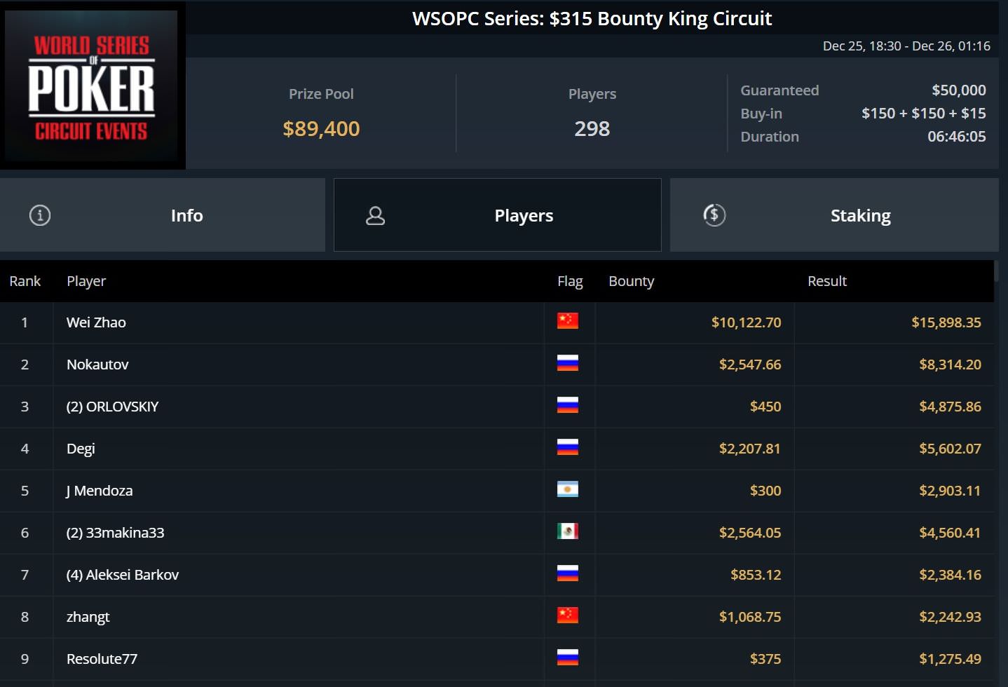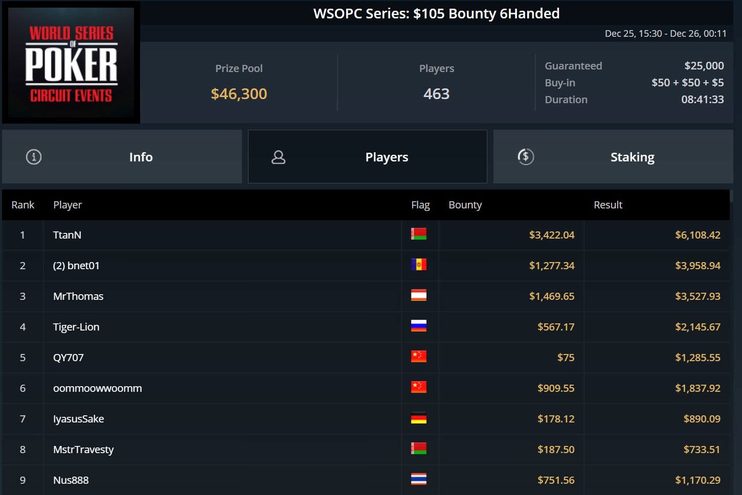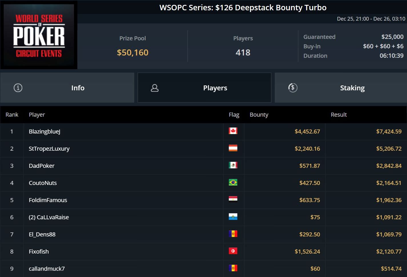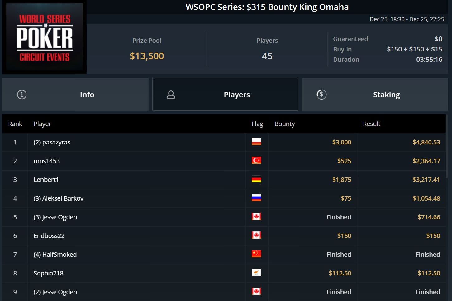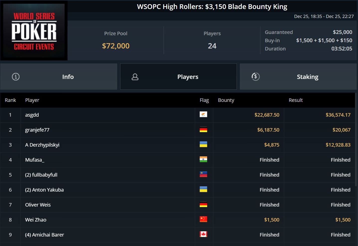Größter Gewinner des Tages war der Zypriote „asgdd“, der beim WSOPC High Roller $3.150 Bounty King alle 23 Konkurrenten hinter sich ließ und über $36.000 kassierte.