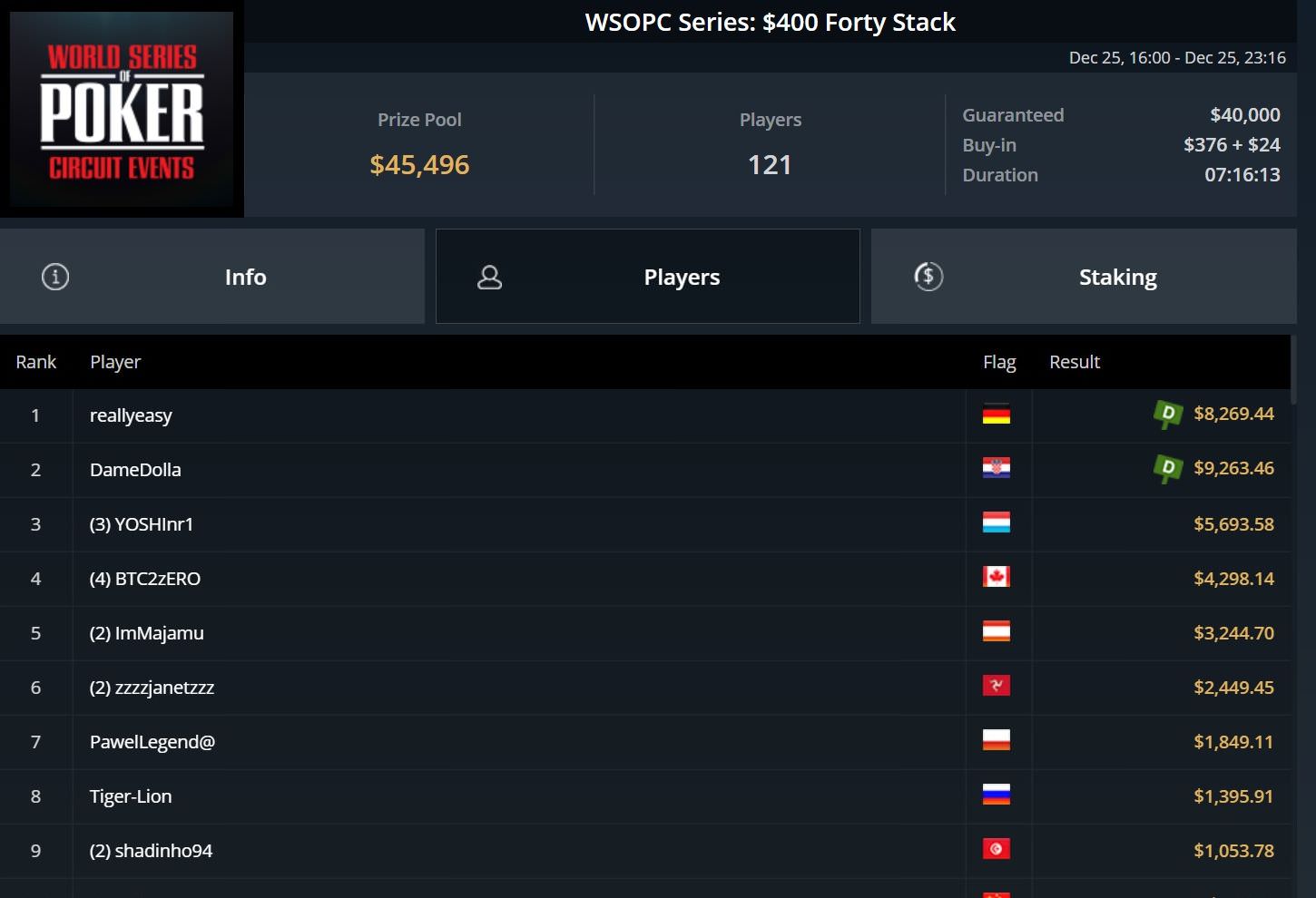Den Platz an der Sonne eroberte „reallyeasy“ beim WSOPC $400 Forty Stack, bei dem 121 Entrys ihr Glück versucht hatten. Nach einem Deal mit dem Kroaten „DameDolla“ erhielt der Deutsche über $8.000 Preisgeld.