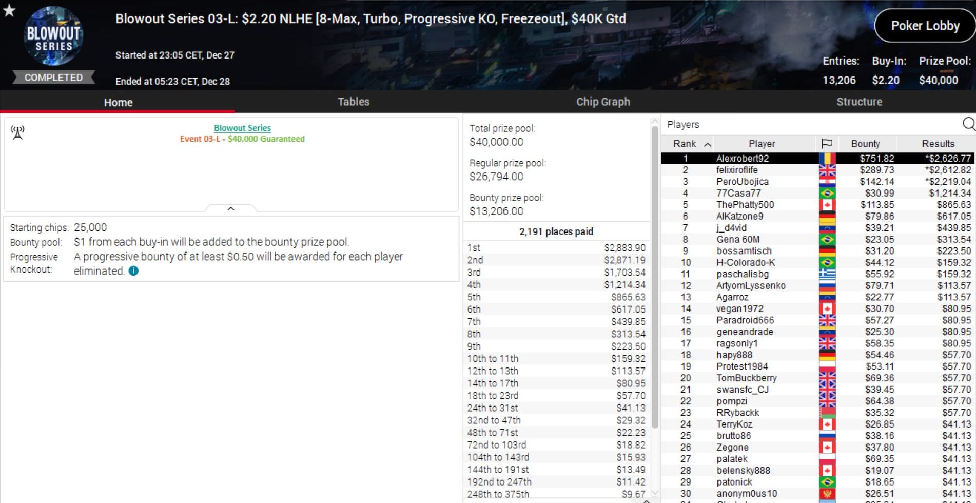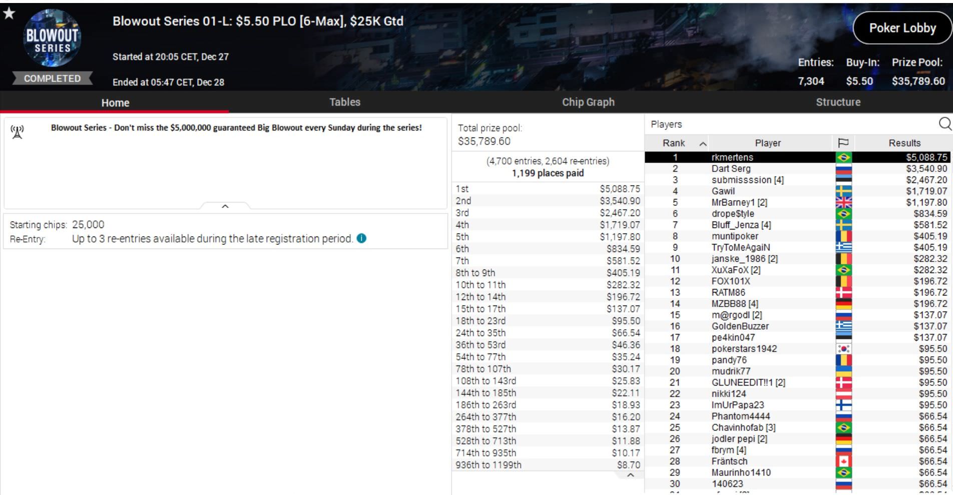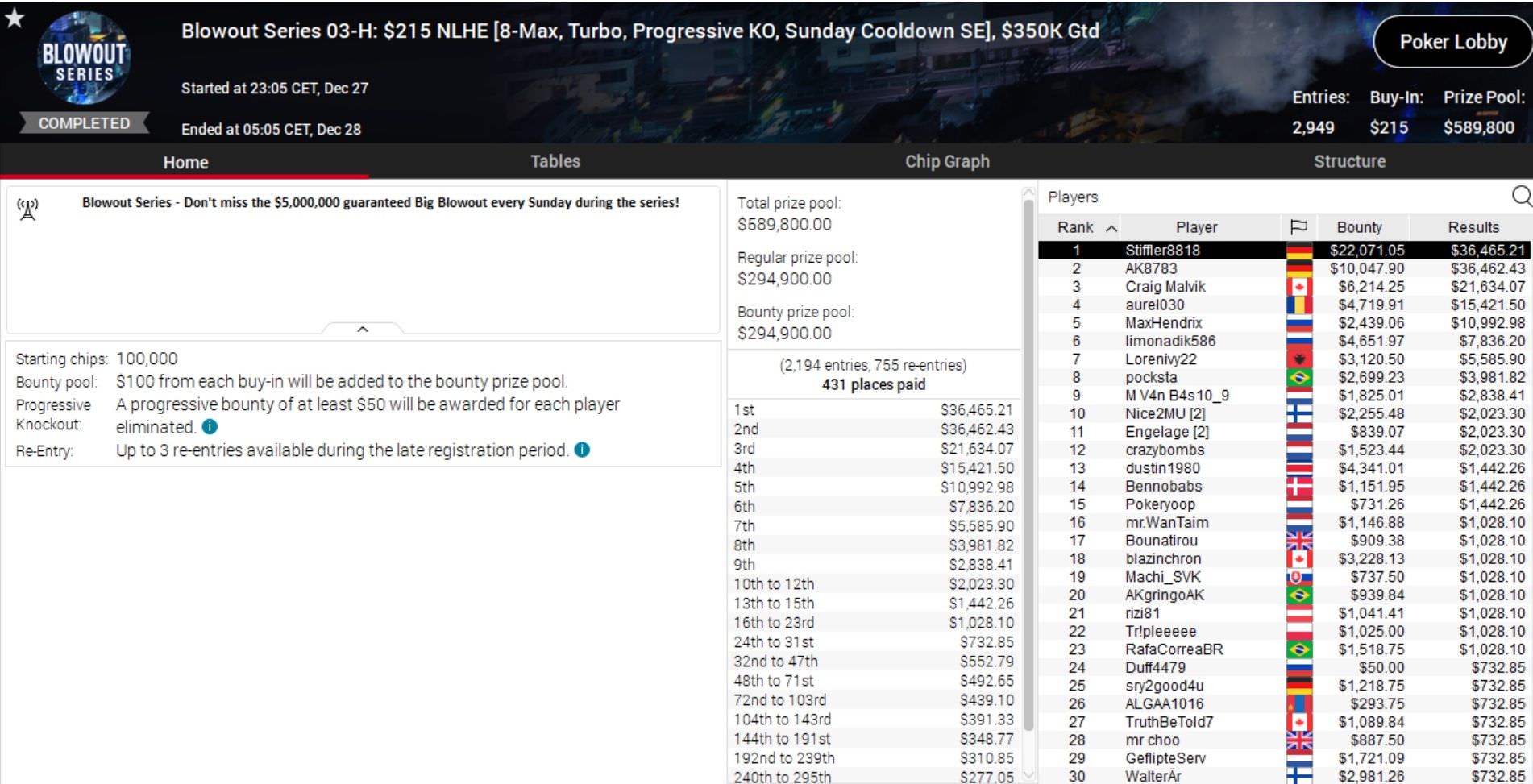 „Stiffler8818” siegte unter 2.949 Startern vor „AK8783” und kassierte mit Bountys über $58.000 Preisgeld. Sein zweitplatzierter Landsmann durfte sich über gut $36.000 freuen.