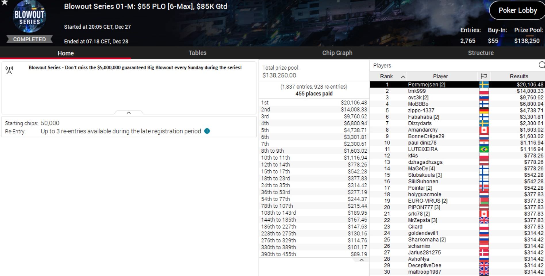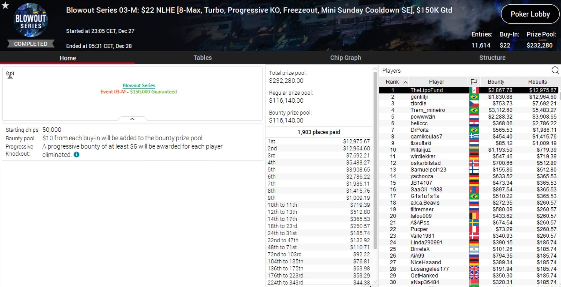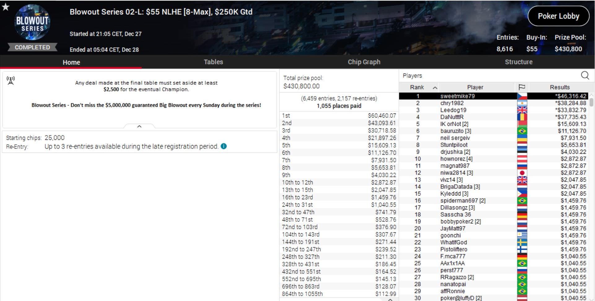 „Stiffler8818” siegte unter 2.949 Startern vor „AK8783” und kassierte mit Bountys über $58.000 Preisgeld. Sein zweitplatzierter Landsmann durfte sich über gut $36.000 freuen.