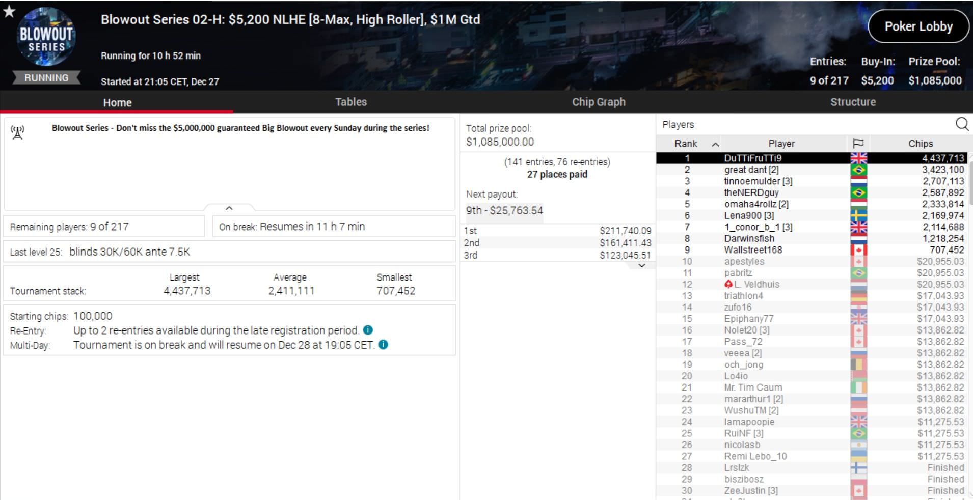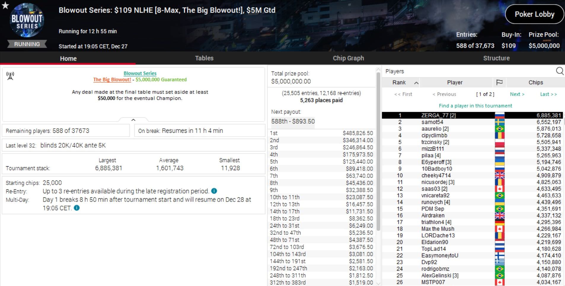 Mit einer Enttäuschung für Veranstaltung PokerStars endete dagegen Tag 1 des $109 Big Blowout!, der statt der Sunday Million ausgetragen wurde und bei dem ein sattes Preisgeld von $5 Millionen garantiert wurde.