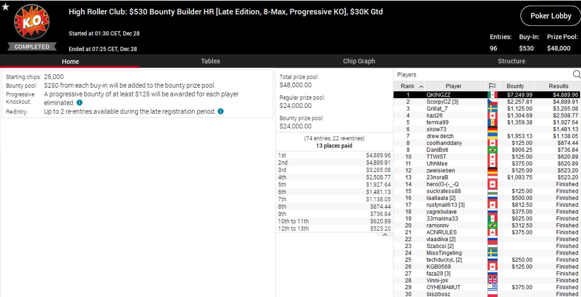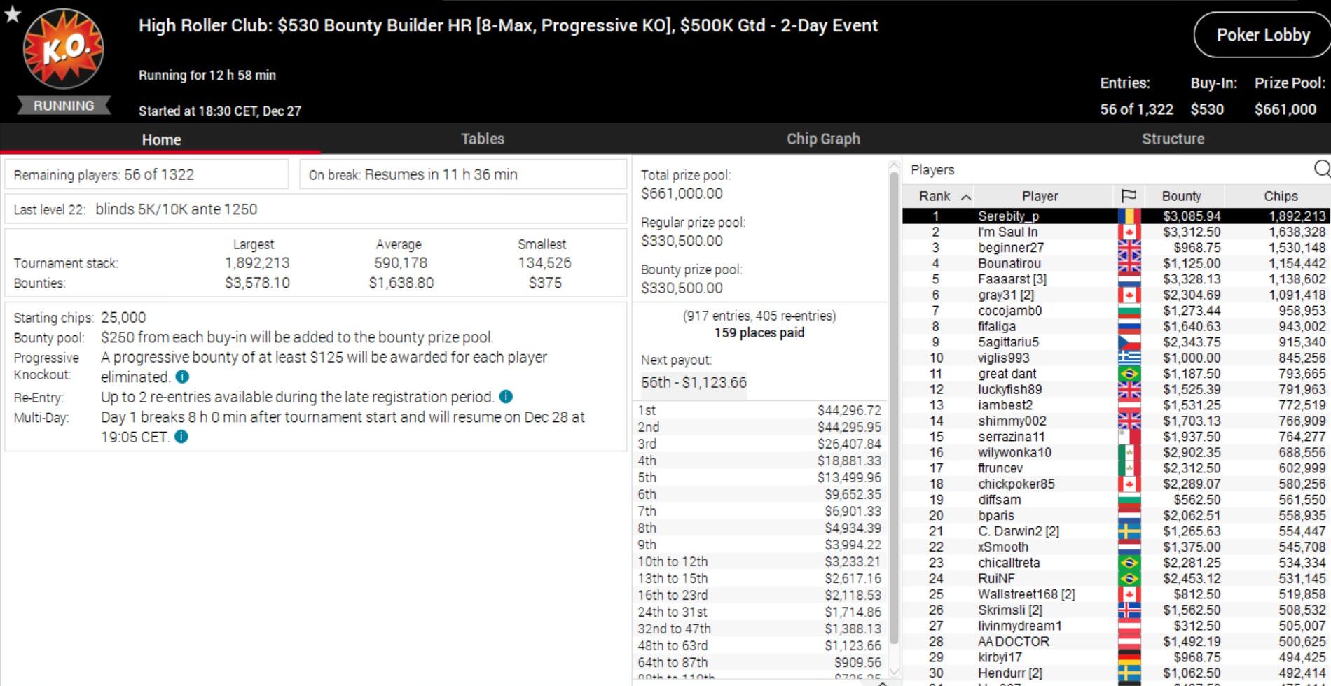 Noch nicht entschieden ist wie üblich der $530 Bounty Builder. 1.322 Entries sorgten für ein Preisgeld von $661.000 und eine fette Siegprämie von über $44.000.